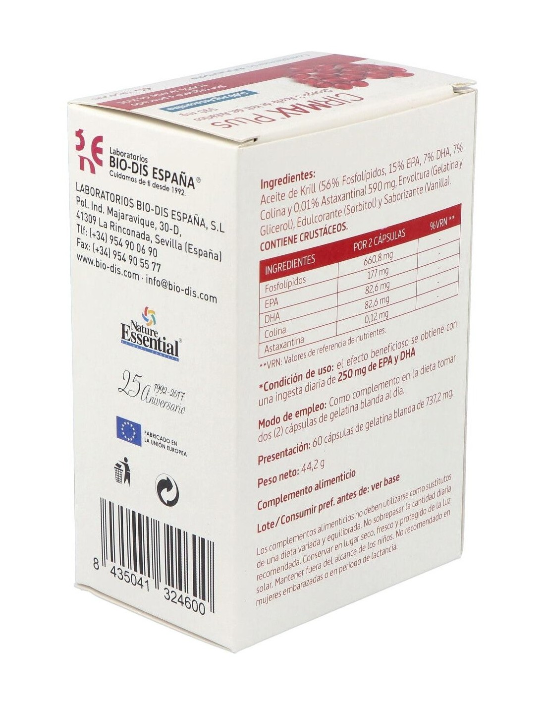 NATURE ESSENTIALComplemento alimenticio elaborado con Aceite de Krill (EPA,DHA,Colina y 0,01% Astaxantina), Envoltura (Gelatina y Glicerol), Edulcorante (Sorbitol) y Saborizante (Vanilla). La rica composición del complemento contribuye a la salud cardiovascular del organismo.