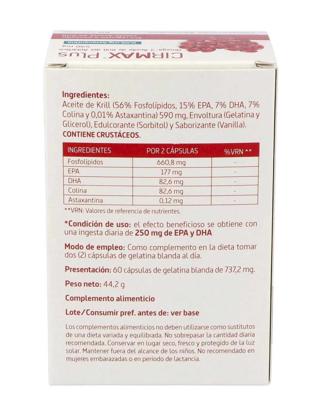 Complemento alimenticio elaborado con Aceite de Krill (EPA,DHA,Colina y 0,01% Astaxantina), Envoltura (Gelatina y Glicerol), Edulcorante (Sorbitol) y Saborizante (Vanilla). La rica composición del complemento contribuye a la salud cardiovascular del organismo. Este producto es un complemento alimenticio. Mantener fuera del alcance de los niños más pequeños. No superar la dosis diaria expresamente recomendada. Almacenar en un lugar fresco y seco. Los complementos alimenticios no son sustitutos de una dieta equilibrada.