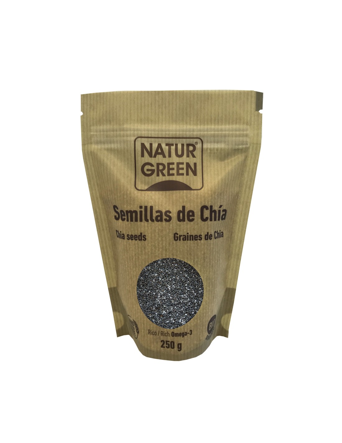 NATURGREENIngredientes:Semillas de Chía* (Salvia hispanica) (100%). (*) Ingredientes procedentes de la agricultura ecológica.Valor nutricional por 100 gramos: