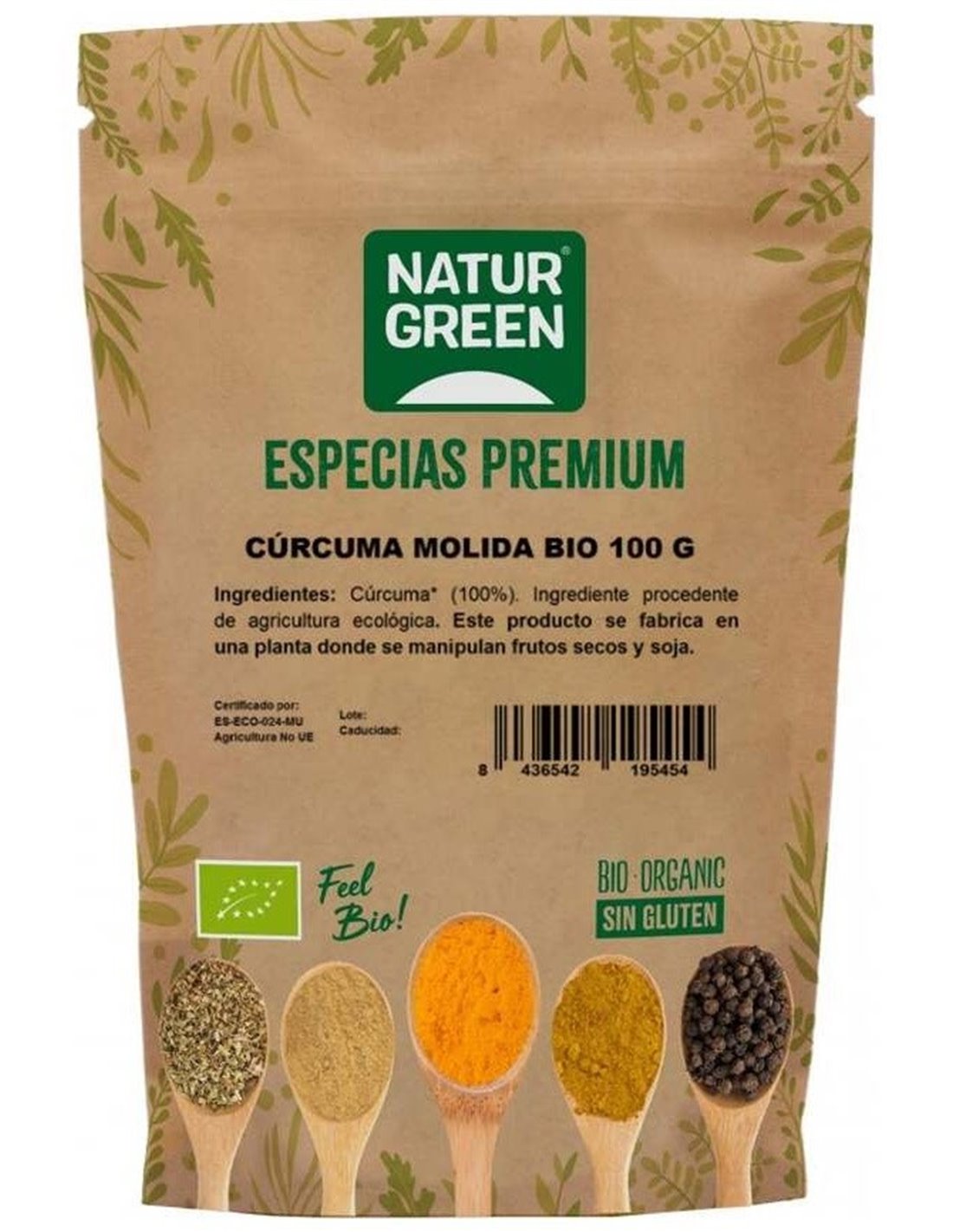 NATURGREENIngredientes:Cúrcuma* (100%). (*) Ingredientes procedentes de la agricultura ecológica.Modo de empleo:Dosificar según gusto para dar a sabor a cualqui