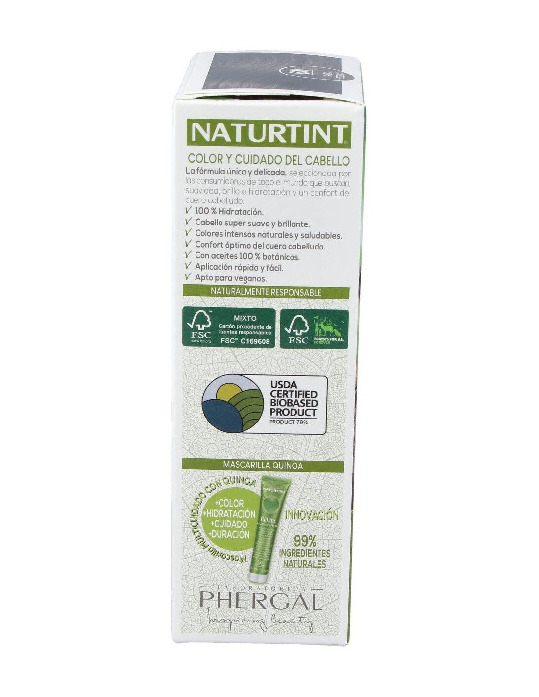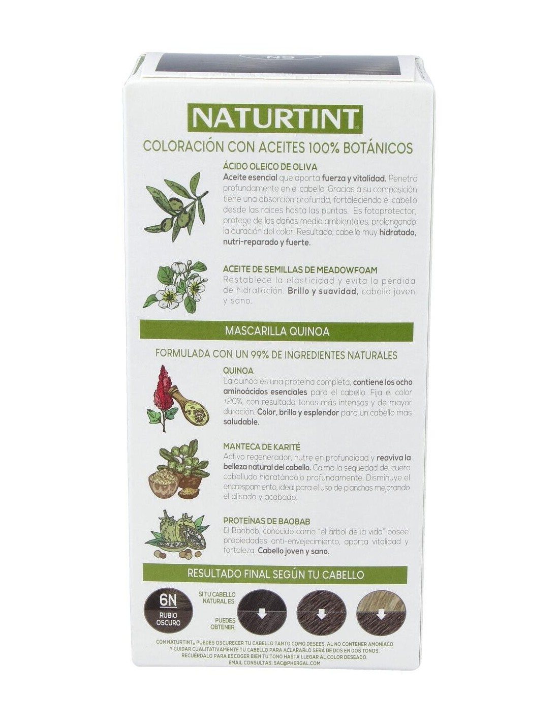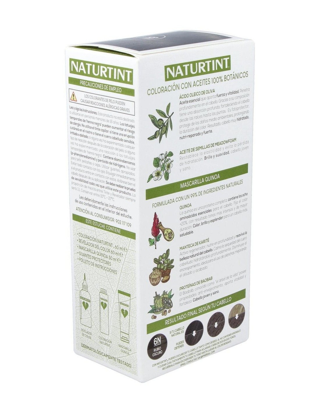 COLORACIÓN NATURTINT 60 ml: PEG-2 OLEAMINE. AQUA (PURIFIED WATER). ALCOHOL DENAT. PEG-4 RAPESEEDAMIDE. PROPANEDIOL. ETHANOLAMINE. OLEIC ACID. HYDROLYZED OAT PROTEIN. HYDROLYZED CORN PROTEIN. HYDROLYZED SOY PROTEIN. HYDROLYZED WHEAT PROTEIN. LIMNANTHES ALBA SEED OIL. TETRASODIUM GLUTAMATE DIACETATE. SODIUM METABISULFITE. SODIUM ERYTHORBATE. p-PHENYLENEDIAMINE. 4-CHLORORESORCINOL. 2 METHYLRESORCINOL. 2-AMINO-4-HYDROXYETHYLAMINOANISOLE SULFATE. m AMINOPHENOL. N,N-BIS (2-HYDROXYETHYL)-p-PHENYLENEDIAMINE SULFATE. OCTADECYL DI-T-BUTYL-4- HYDROXYHYDROCINNAMATE.