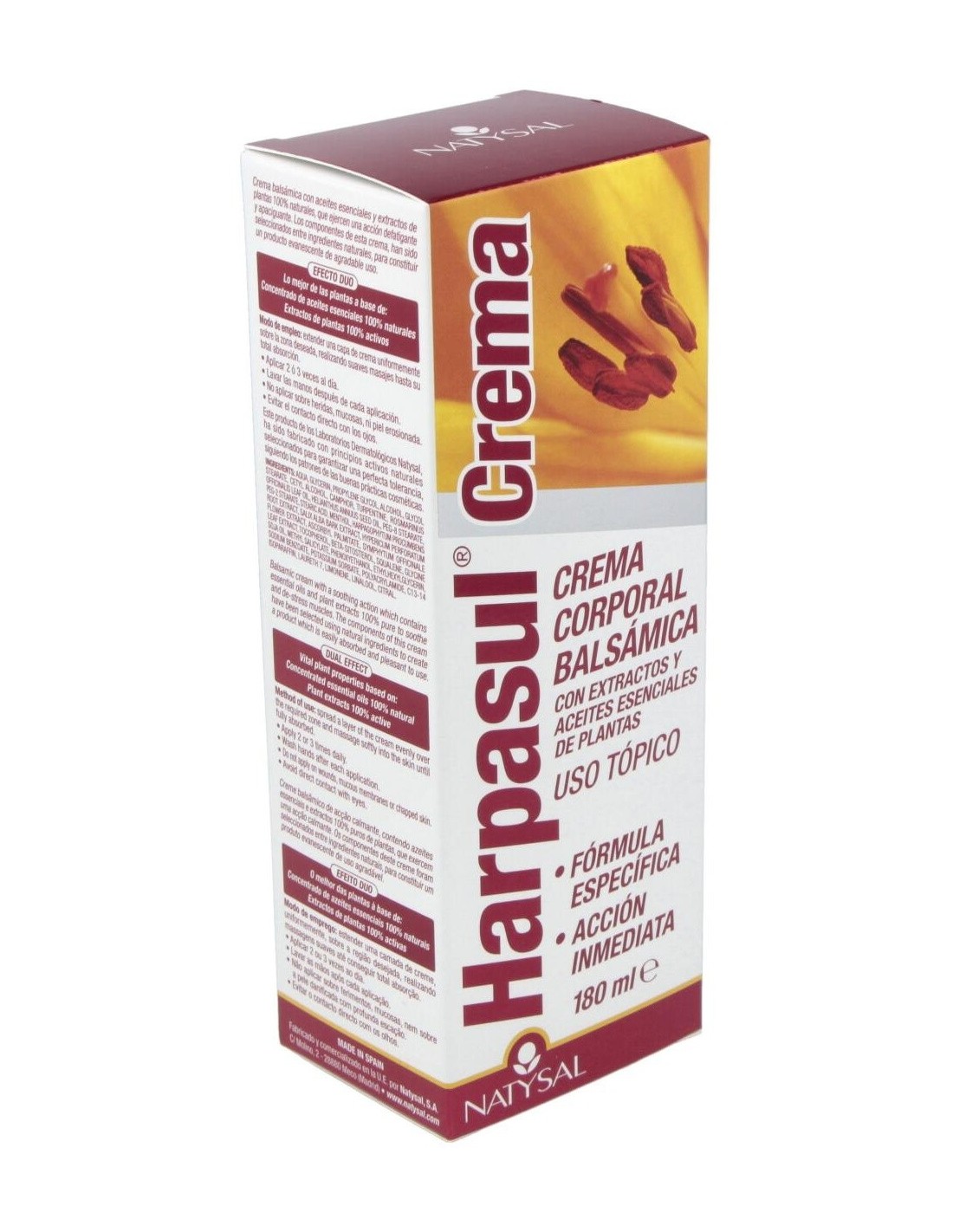 Harpasul Crema Corporal (Harpagofito Forte Crema) 180 ml. de Natysal es una crema diseñada para personas que buscan un cuidado corporal con ingredientes de origen natural. Su formulación está pensada para quienes desean una aplicación tópica que aporte sensación de confort y bienestar en la piel.
