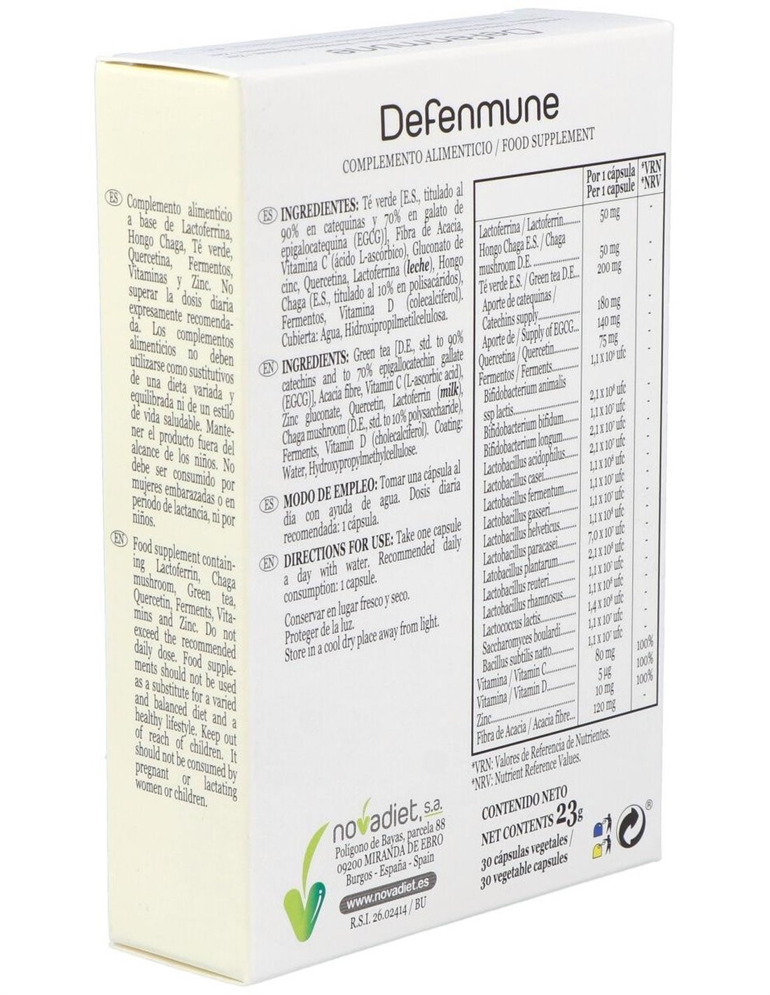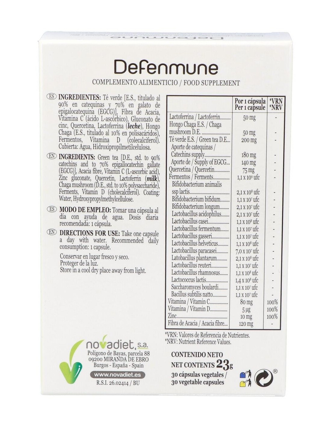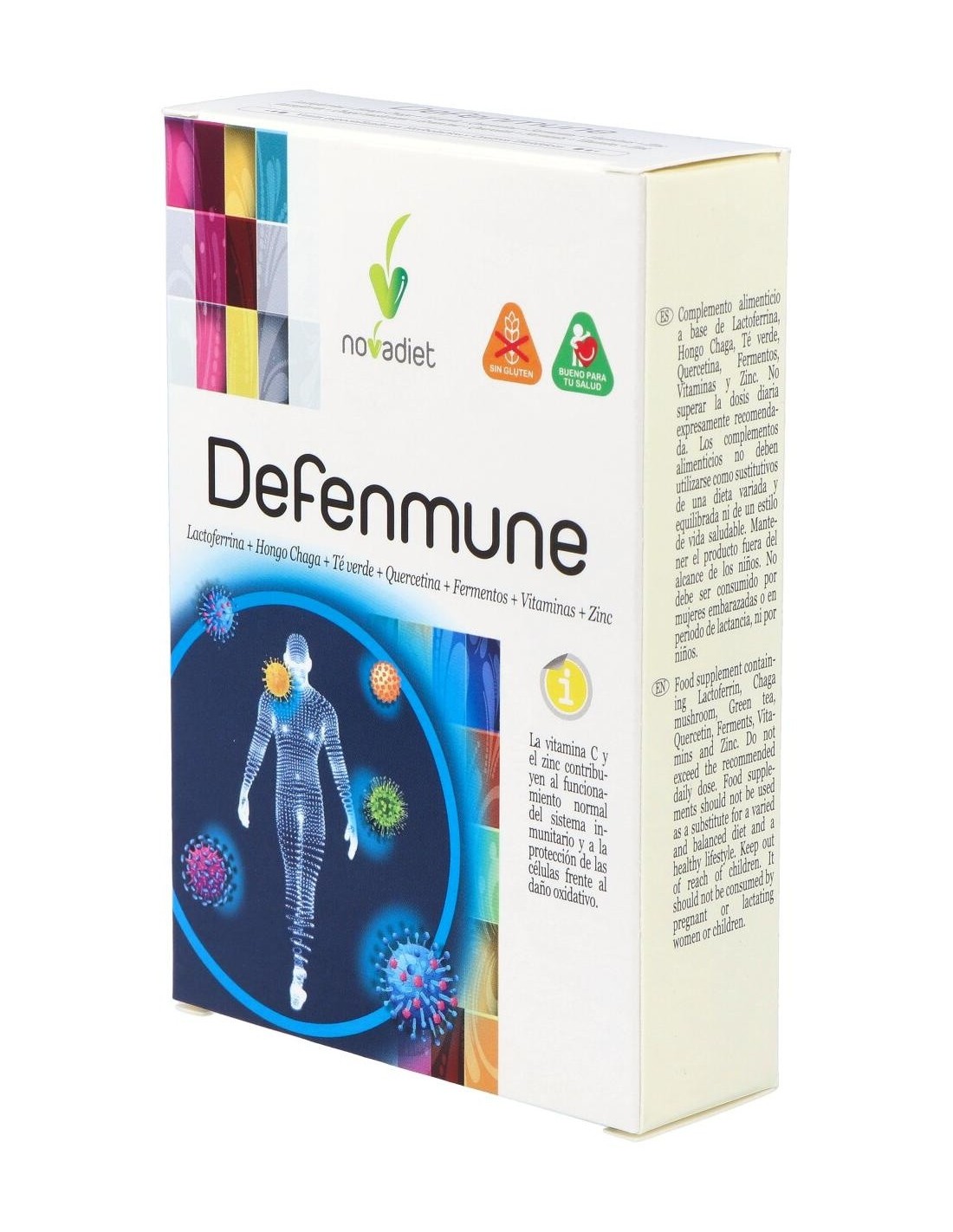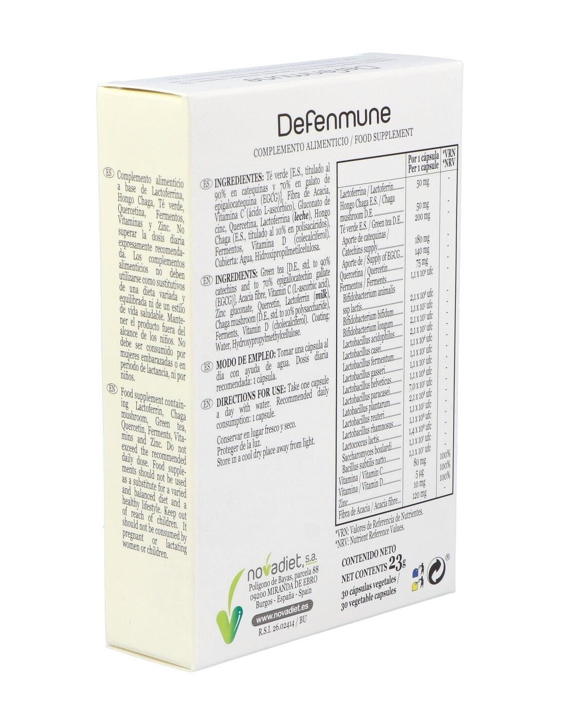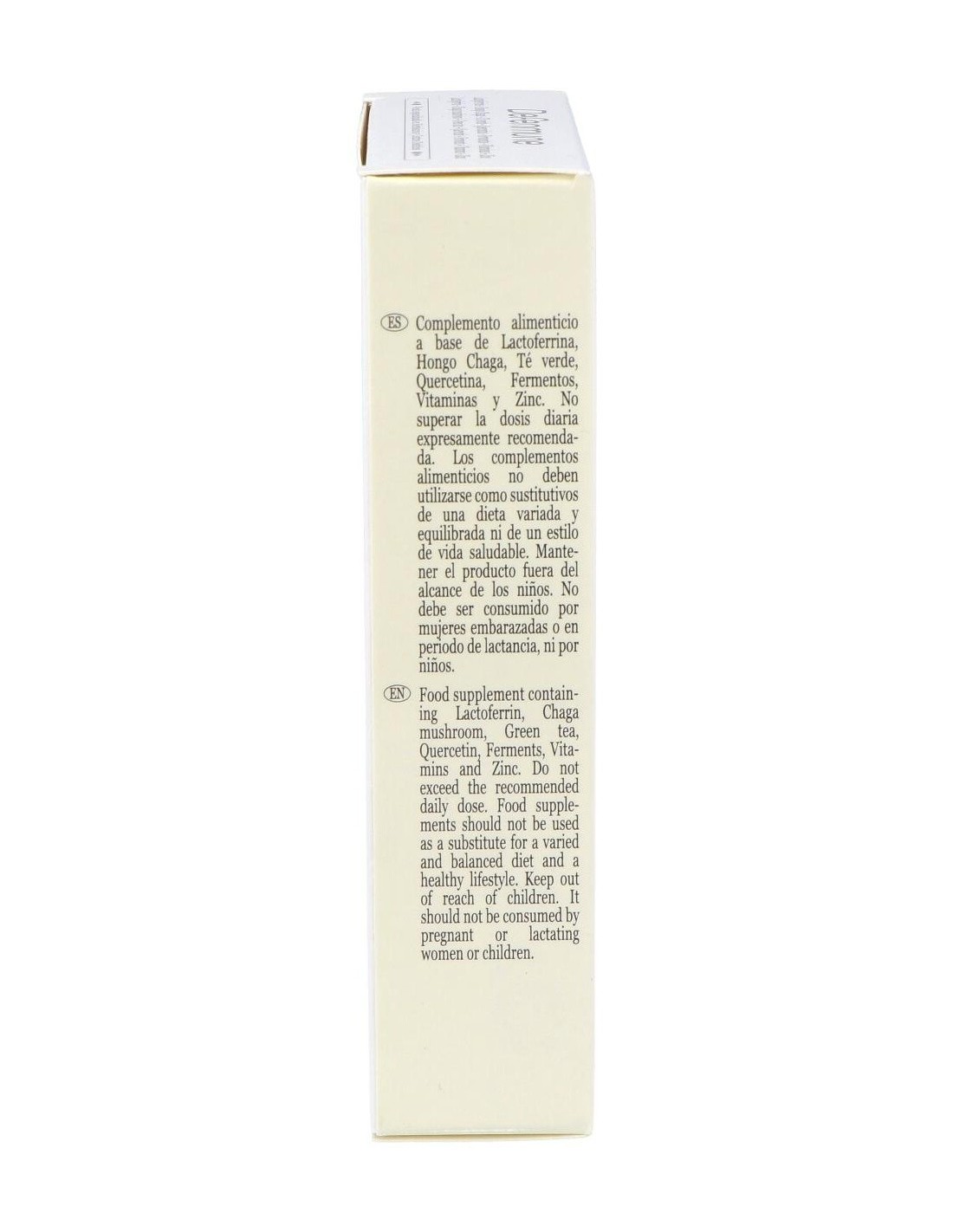 Complemento alimenticio elaborado para ayudar a prevenir infecciones en el organismo reforzando las defensas del sistema inmunitario. Contiene lactoferrina,una glucoprotei´na que retiene el hierro libre impidiendo que este´ disponible para los microorganismos y ayuda a inhibir la entrada de ciertos virus a las ce´lulas. Con hongo chaga, fuente de glucanos con accio´n inmunomoduladora. Contiene té verde, quercetina y cepas de fermentos bacterianas que ayudan a mejorar la microbiota intestinal.