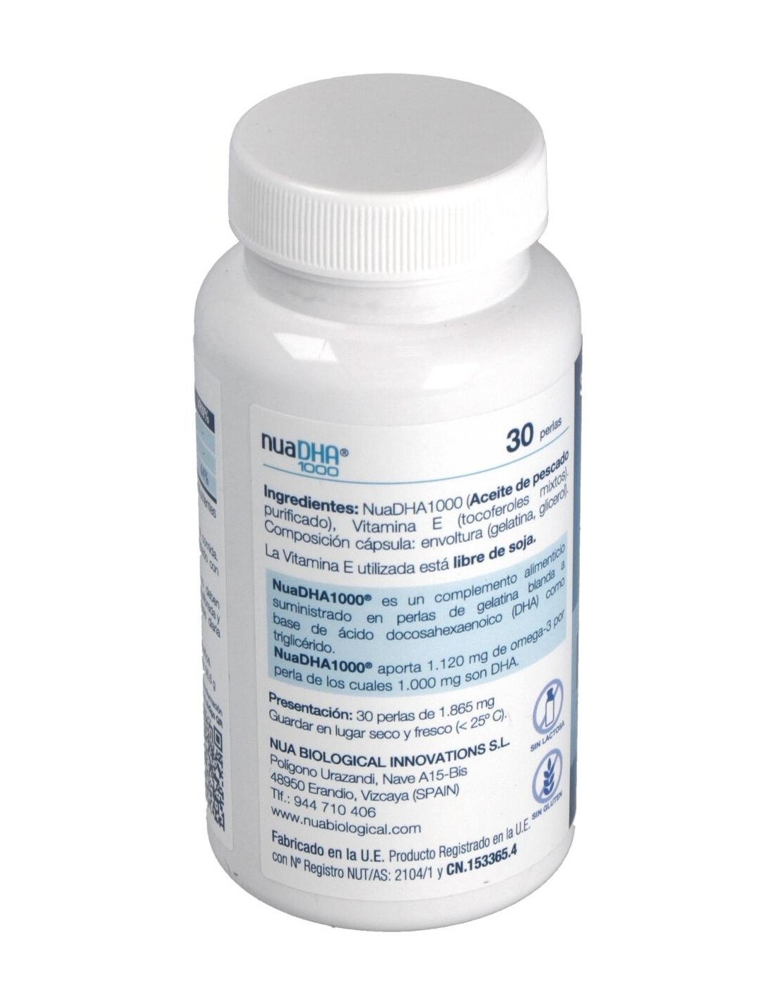 Complemento alimenticio muy puro y concentrado a base de omega-3 (procedente de pescado). Una perla de NuaDHA 1000 contiene aprox. 90% de omega-3, de los cuales más de un 85% son DHA.