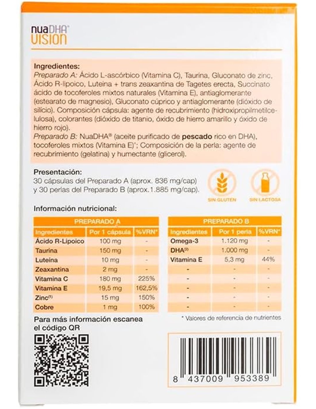 Suplemento destinado a apoyar la salud visual en la edad adulta debido a su composición de nutrientes como luteína, zeaxantina y vitaminas, entre otros.
