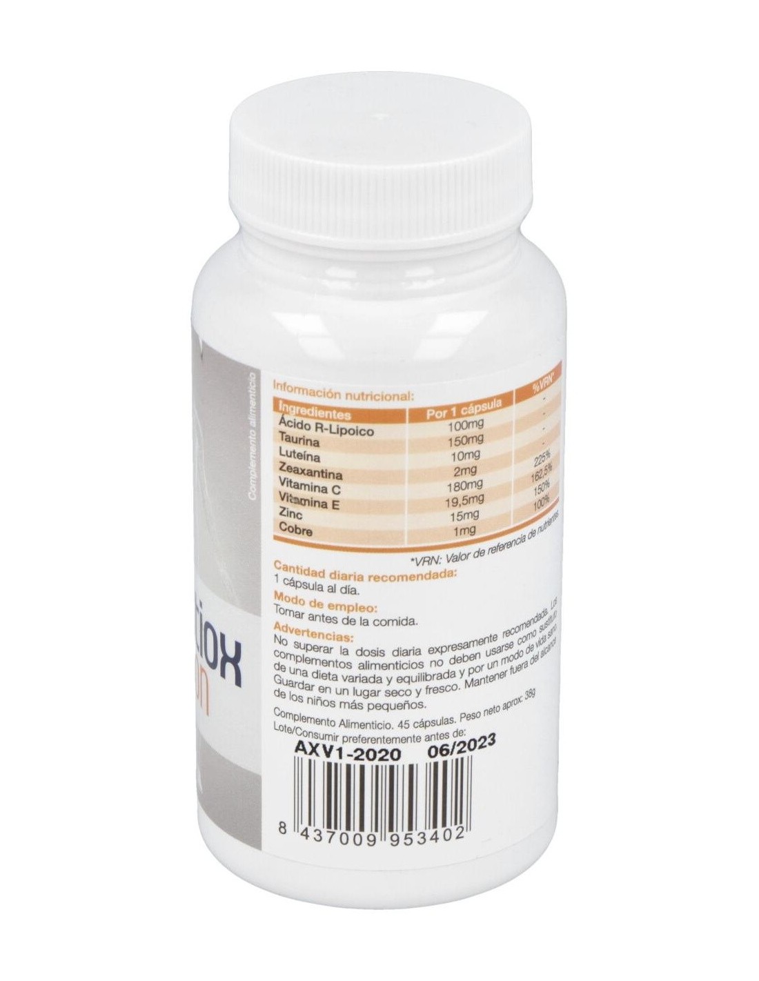 Vitamina C / Ácido Ascórbico (180 mg), Vitamina C (180 mg), Taurina / L-Taurina (150 mg), Taurina (150 mg), Ácido R-Lipoico (100 mg), Vitamina E / Tocoferol (19.5 mg), Vitamina E (19.5 mg), Cobre (15 mg), Zinc (15 mg), Luteína (10 mg), Zeaxantina (Extracto de flor de caléndula) (2 mg), Zeaxantina (2 mg).