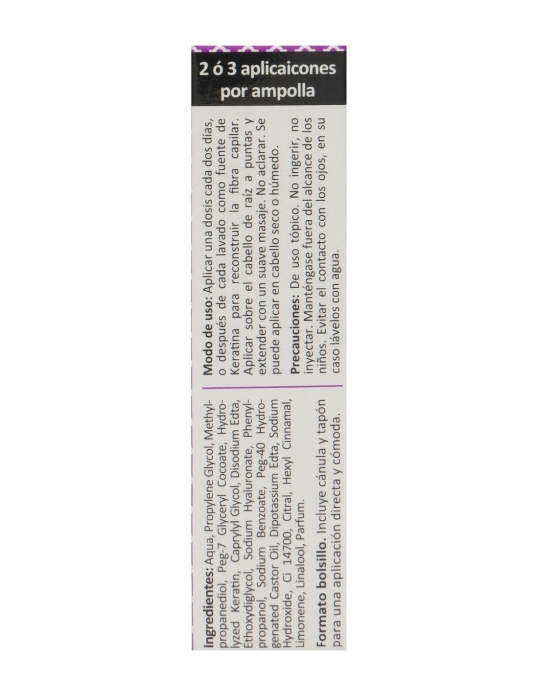 Aplicar una dosis cada dos días, o después de cada lavado como fuente de Keratina para reconstruir la fibra capilar.