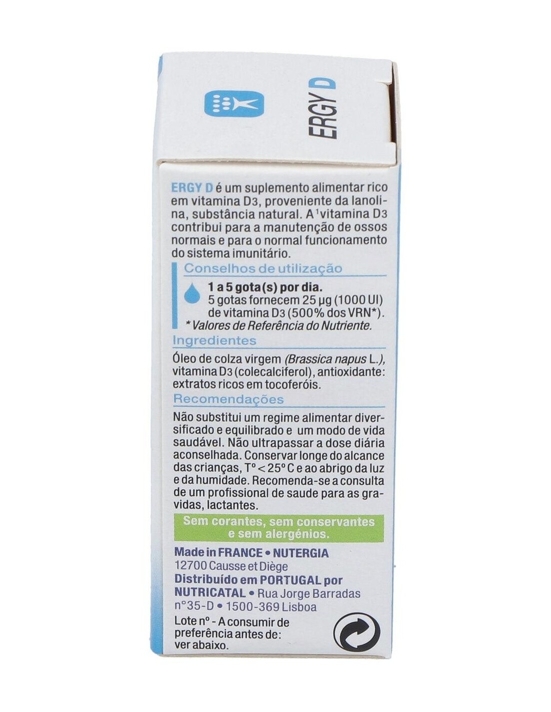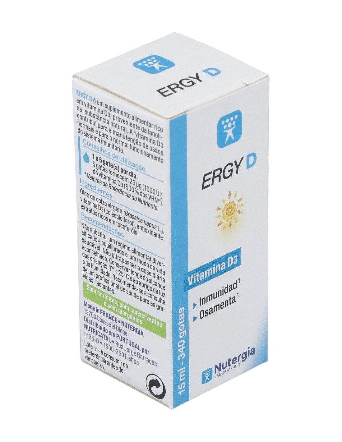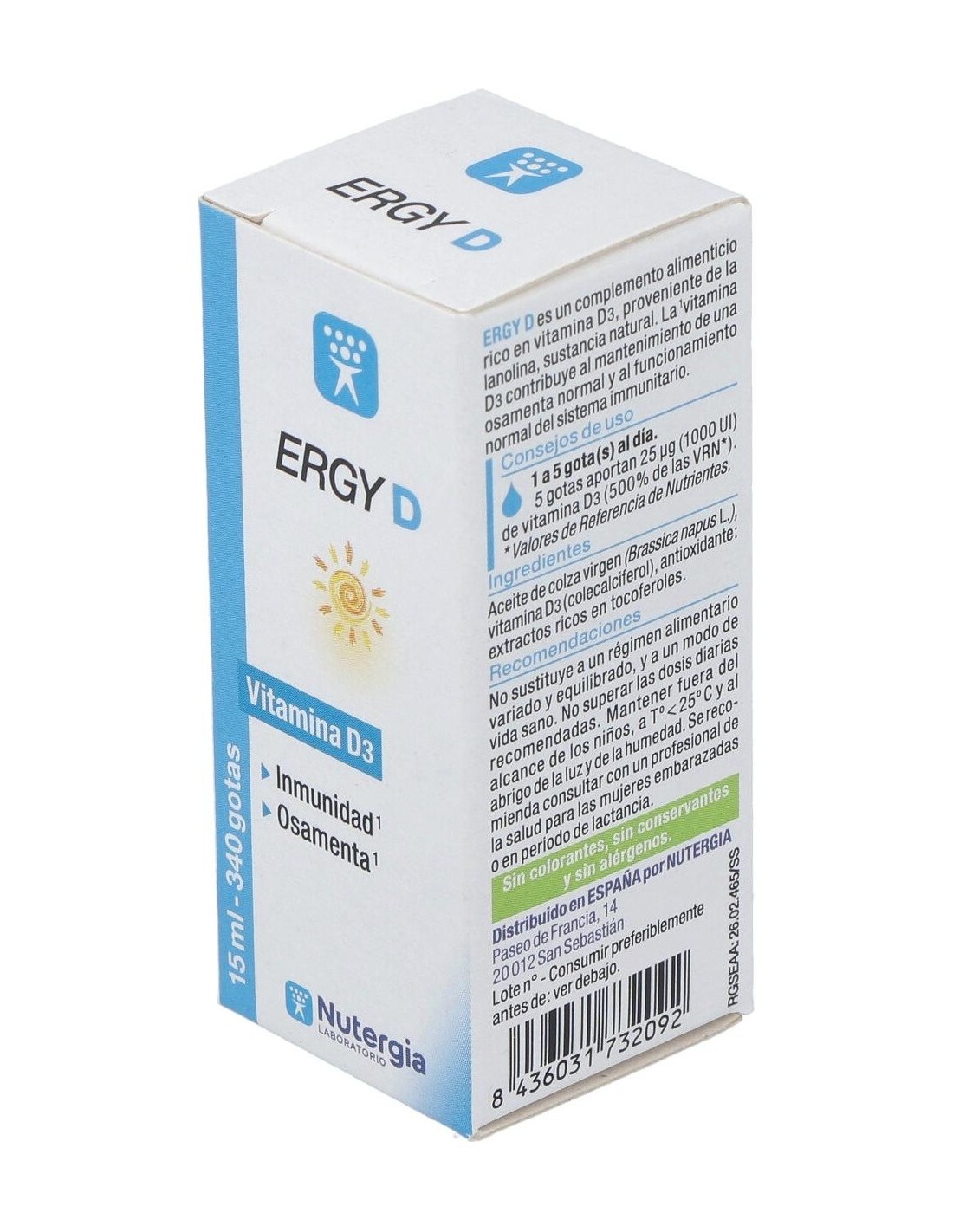 Ergy-D aporta colecalciferol o vitamina D3 de origen natural. Al ser una vitamina liposoluble, su soporte es el aceite virgen de colza, de primera presión en frío, enriquecido en vitamina E de origen natural para preservarla. La vitamina D3 (colecalciferol) juega un papel fundamental en el mantenimiento de la salud ósea y muscular, regulando el metabolismo del cuerpo.Indicado en los siguientes casos: