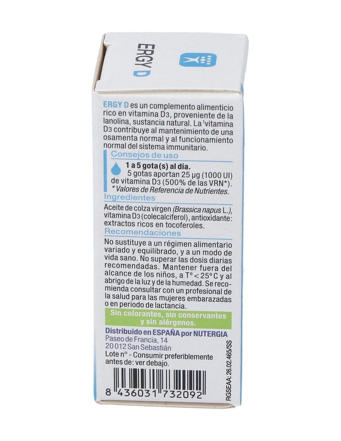 NUTERGIAErgy-D aporta colecalciferol o vitamina D3 de origen natural. Al ser una vitamina liposoluble, su soporte es el aceite virgen de colza, de primera pre