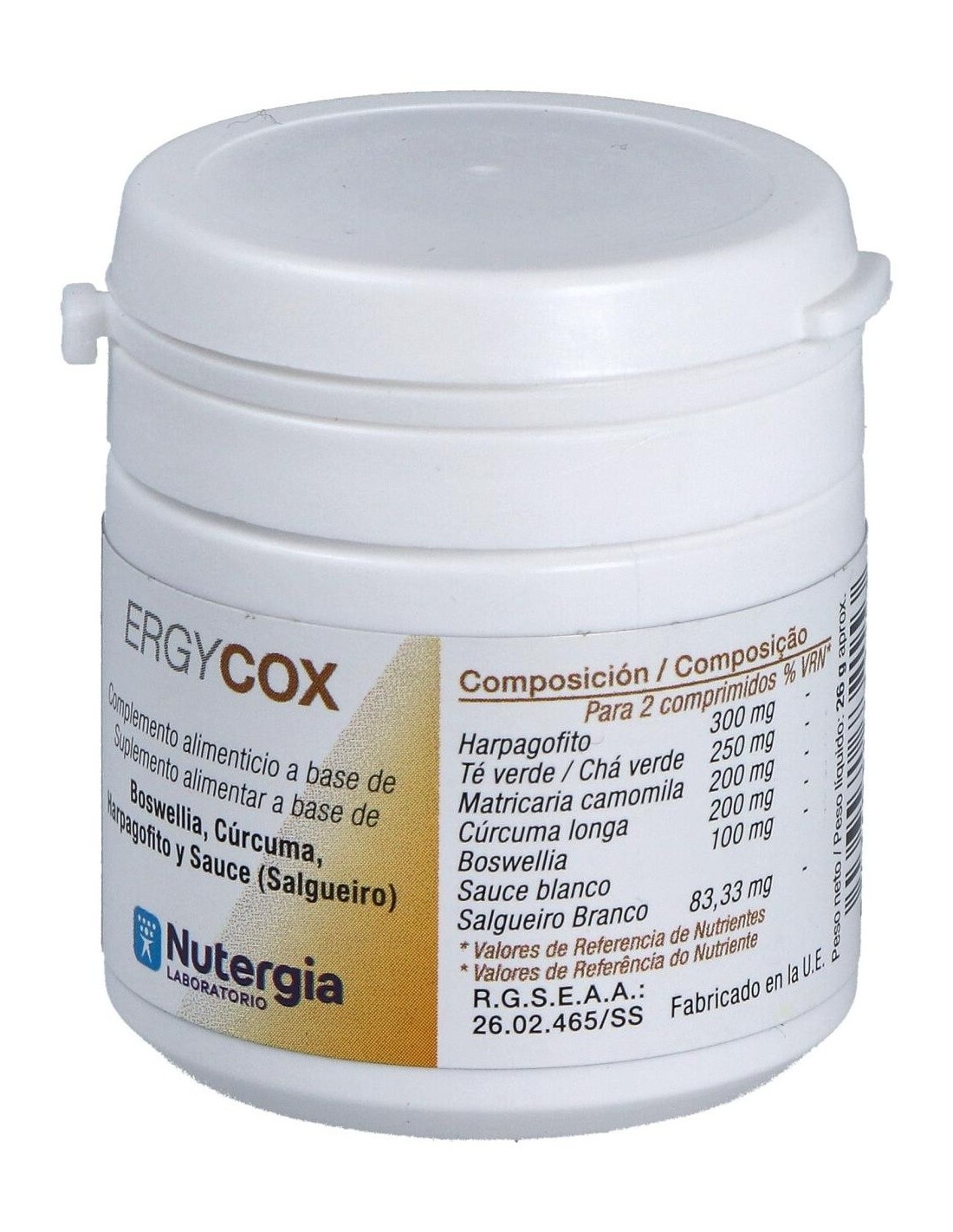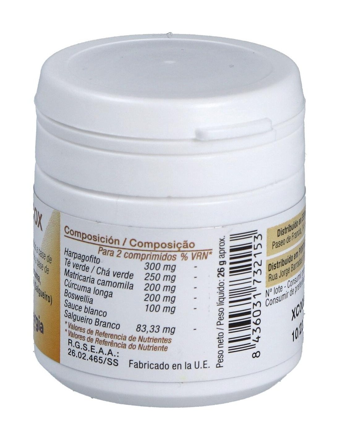 Extracto seco de Harpagofito (Harpagophytum procumbens (Burch.) DC., 2% Harpagosidos), celulosa microscristalina y fosfato bicálcico dihidratado, extracto seco de Té verde (Camellia sinensis (L.) Kuntze, 95% polifenoles, 70% catequinas, 40% EGCG (Epigalocatequina-3-Galato), extracto seco de Matricaria camomilla (Matricaria recutita L., 1% flavonas), extracto seco de Cúrcuma longa (Curcuma longa L., 50% curcuminoides), extracto seco de Boswellia (Boswellia serrata Roxb. Ex Colebr, 10% ácidos boswélicos) y extracto seco de Sauce blanco (Salix alba L., 25% Salicina), estearato de magnesio y dióxido de silicio.