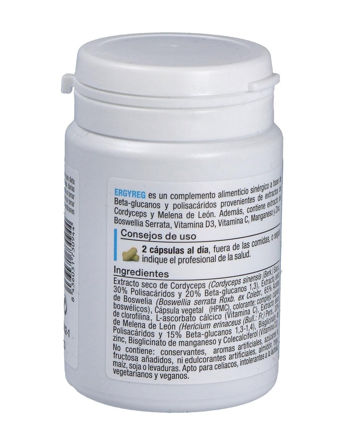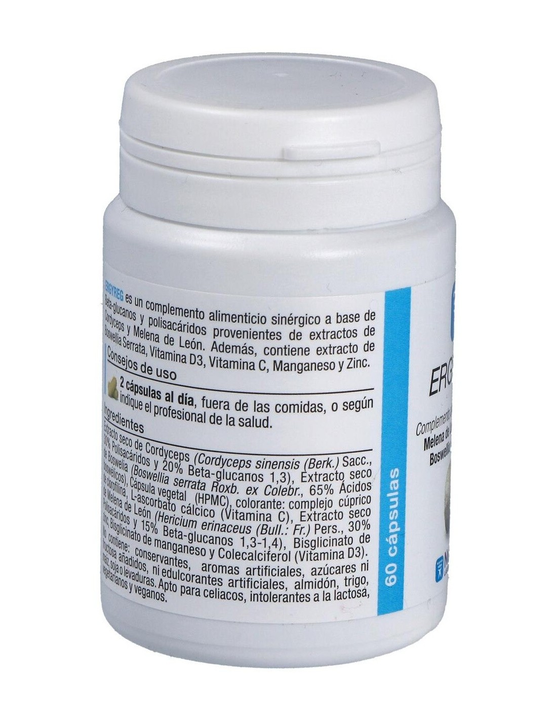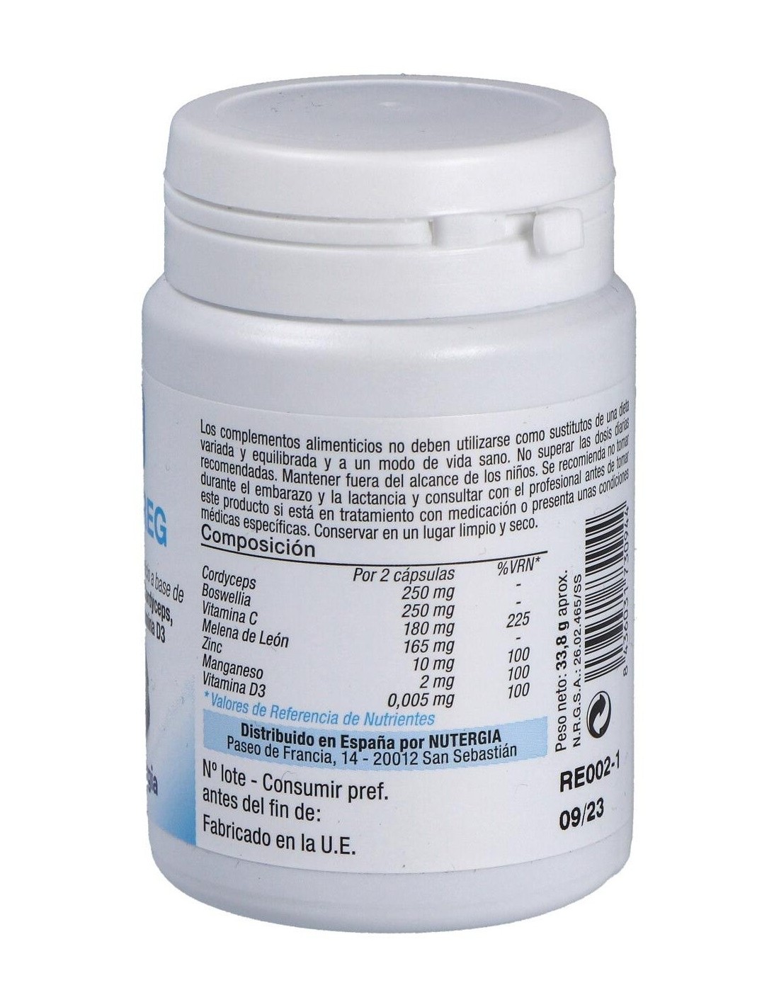 Ingredientes:Extracto seco de Cordyceps (Cordyceps sinensis (Berk.) Sacc., 30% Polisacáridos y 20% Beta-glucanos 1,3), Extracto seco de Boswelia (Boswellia Serrata Roxb. ex Colebr., 65% Ácidos boswélicos), Cápsula vegetal (HPMC), colorante: complejo cúprico de clorofilina, L-ascorbato cálcico (Vitamina C), Extracto seco de Melena de León (Hericium erinaceus (BulI.: Fr.) Pers., 30% Po-lisacáridos y 15% Beta-glucanos 1,3-1,4), Bisglicinato de zinc, Bisglicinato de manganeso y Colecalciferol (Vitamina D3).Modo de empleo:Tomar 2 cápsulas al día.Presentación:Bote de 60 cápsulas.