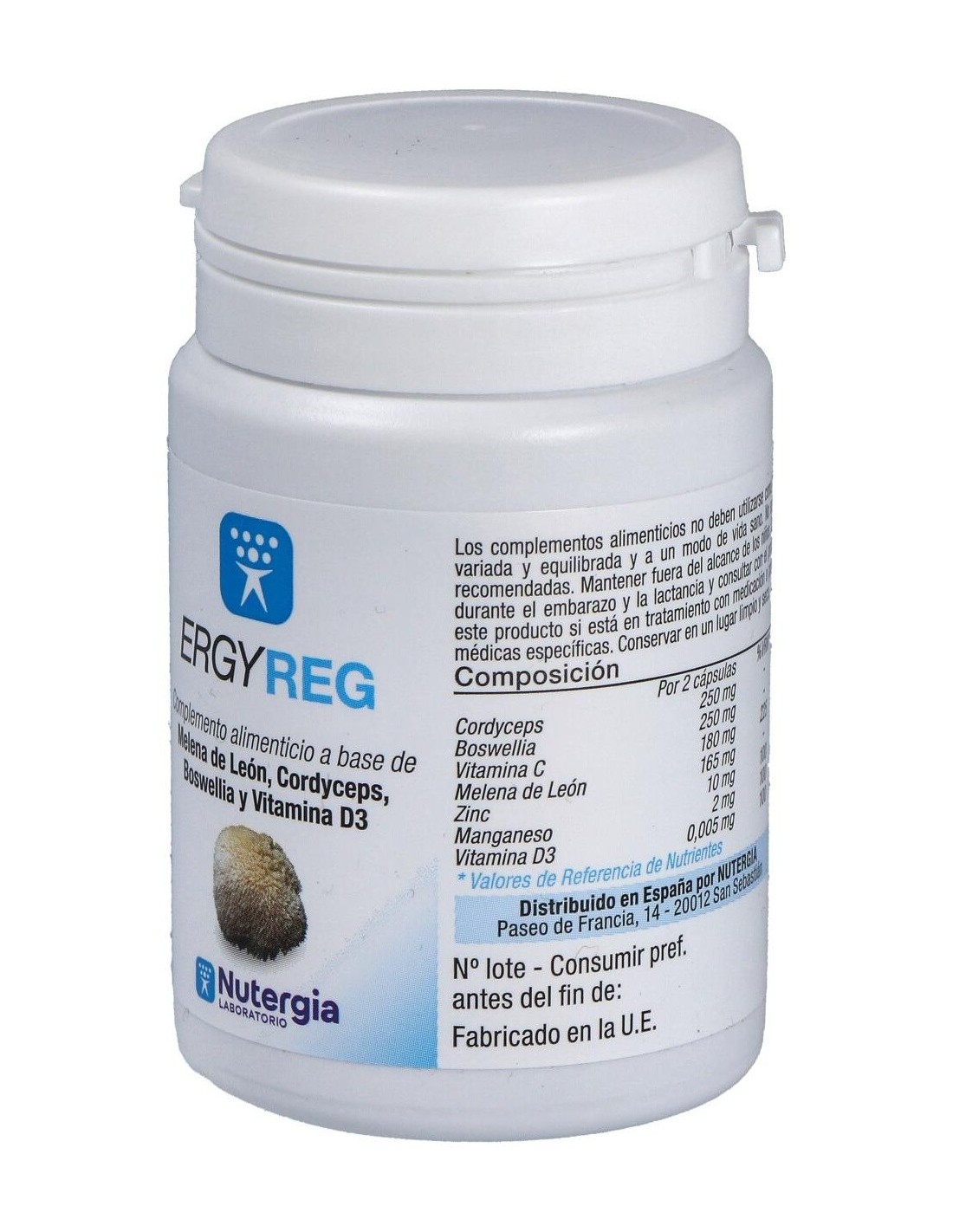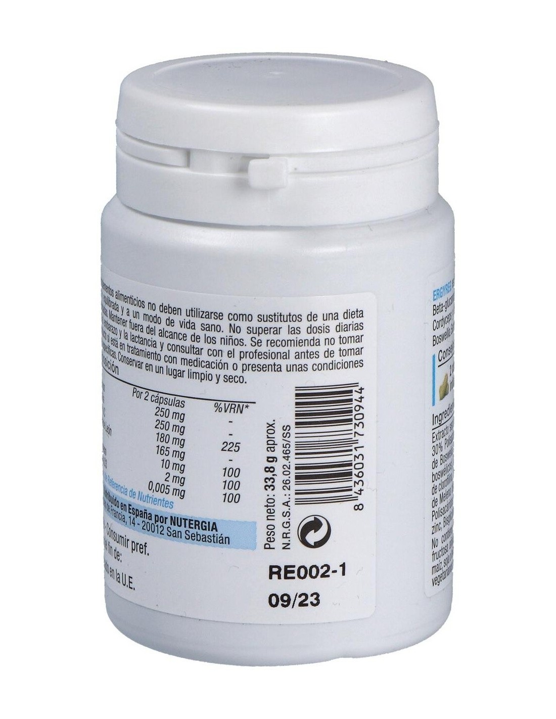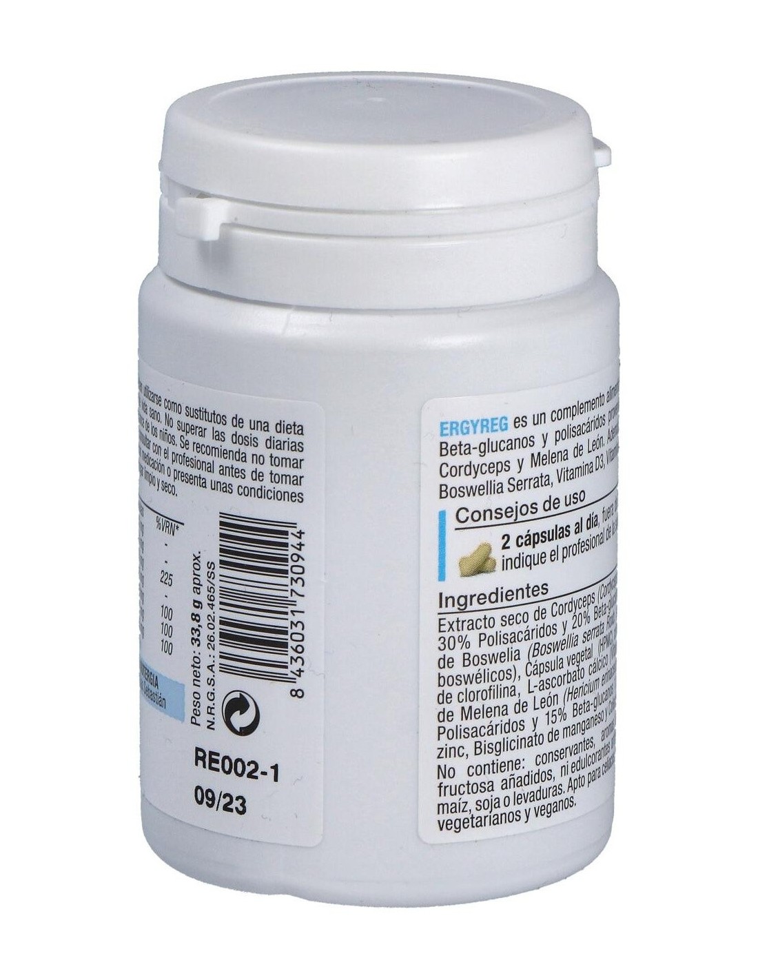 Ingredientes:Extracto seco de Cordyceps (Cordyceps sinensis (Berk.) Sacc., 30% Polisacáridos y 20% Beta-glucanos 1,3), Extracto seco de Boswelia (Boswellia Serrata Roxb. ex Colebr., 65% Ácidos boswélicos), Cápsula vegetal (HPMC), colorante: complejo cúprico de clorofilina, L-ascorbato cálcico (Vitamina C), Extracto seco de Melena de León (Hericium erinaceus (BulI.: Fr.) Pers., 30% Po-lisacáridos y 15% Beta-glucanos 1,3-1,4), Bisglicinato de zinc, Bisglicinato de manganeso y Colecalciferol (Vitamina D3).Modo de empleo:Tomar 2 cápsulas al día.Presentación:Bote de 60 cápsulas.