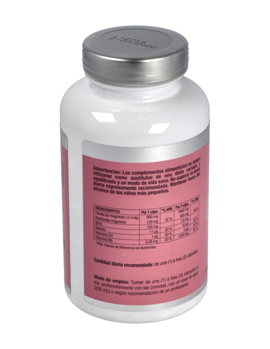 Citrato de magnesio, agente de recubrimiento (hidroxipropilmetilcelulosa), borato sódico, antiaglomerante (estearato de magnesio), agente de carga (celulosa microcristalina), L-selenometionina, colorante (dióxido de titanio), colecalciferol y clorhidrato de piridoxina.