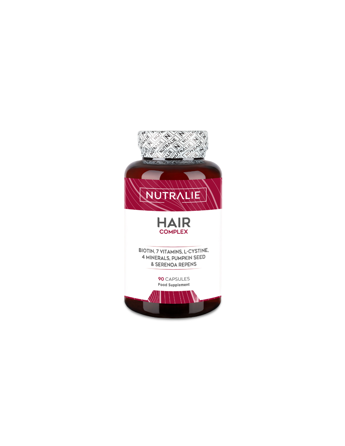 Hair Complex está formulado a base de L-Cistina, Biotina, Selenio, Zinc, Cobre, Semillas de Calabaza y Serenoa Serrulata. Una fórmula compleja con una alta combinación de vitaminas, minerales y extractos naturales que ha sido diseñada para aportar los nutrientes necesarios para fortalecer el cabello dándole un mayor volumen y brillo, así como facilitando el crecimiento de un cabello sano y fuerte.La fórmula de Hair Complex está compuesta por 8 vitaminas y 4 minerales, entre las cuales destacamos la Vitamina B6 que favorece la circulación sanguínea y por tanto, ayuda a sintetizar queratina, la proteína responsable de dar brillo, volumen y suavidad al cabello.La Vitamina C y E, conocidas como potentes antioxidantes, favorecen la preservación del bulbo piloso. La combinación de Selenio y Zinc junto con la Vitamina C y E, contribuye a la protección de las células frente al daño oxidativo. Asimismo, el Cobre, también presente en la fórmula, contribuye a la pigmentación normal del cabello.Composición activa por cápsula: