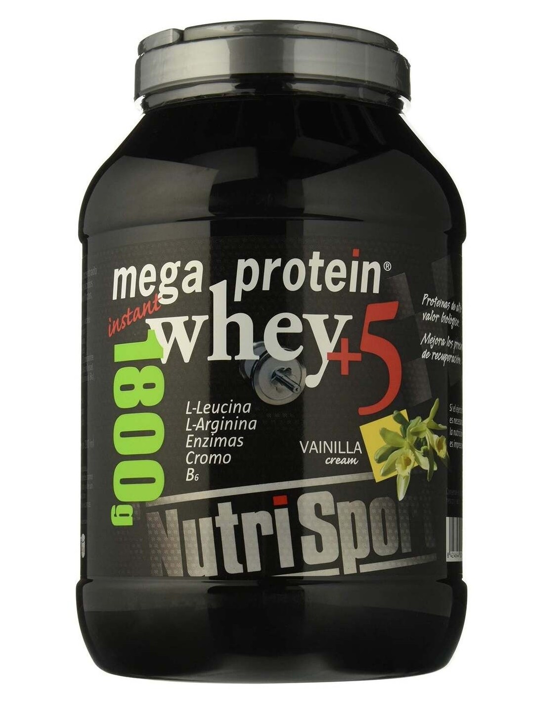 Mega Protein Nutrisport Whey 5 - Vainilla + 1800 g. es un complemento alimenticio a base proteínas de suero lácteo (Whey Protein Concentrate) junto con una combinación de otros 5 ingredientes seleccionados que actúan en procesos metabólicos (L-Arginina, L-Leucina, Vitamina B6, Cromo y Extractos proteolíticos), vitamina B6 y cromo. Sabor vainilla.