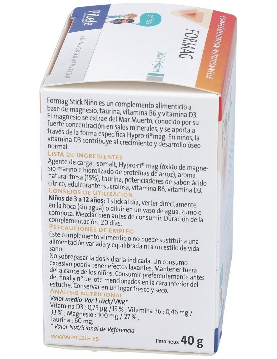 PILEJEComposiciónIngredientes: Agente de carga: inulina de achicorea, aroma natural (14.3%), hypro-ri®mag (óxido de magnesio marino y proteínas de arroz hidrolizadas), potenciadores del sabor: ácido cítrico y ácido málico, citrato de magnesio, taurina, edulcorante: glucósidos de esteviol extractos de estevia, vitamina B6, vitamina D3.