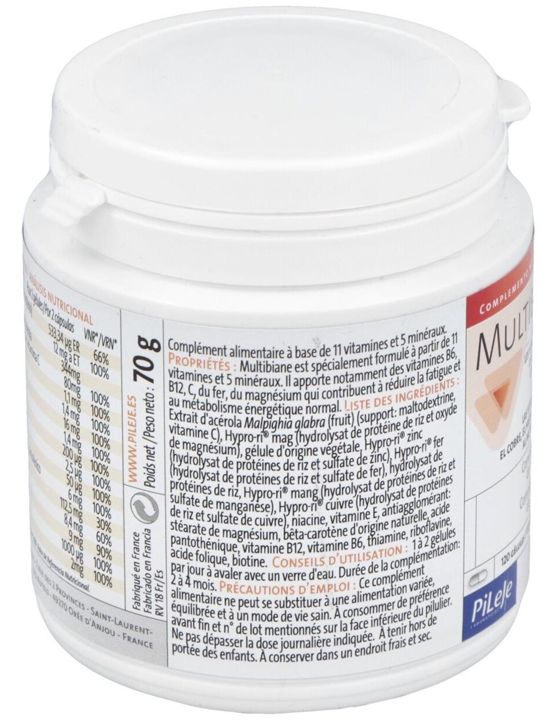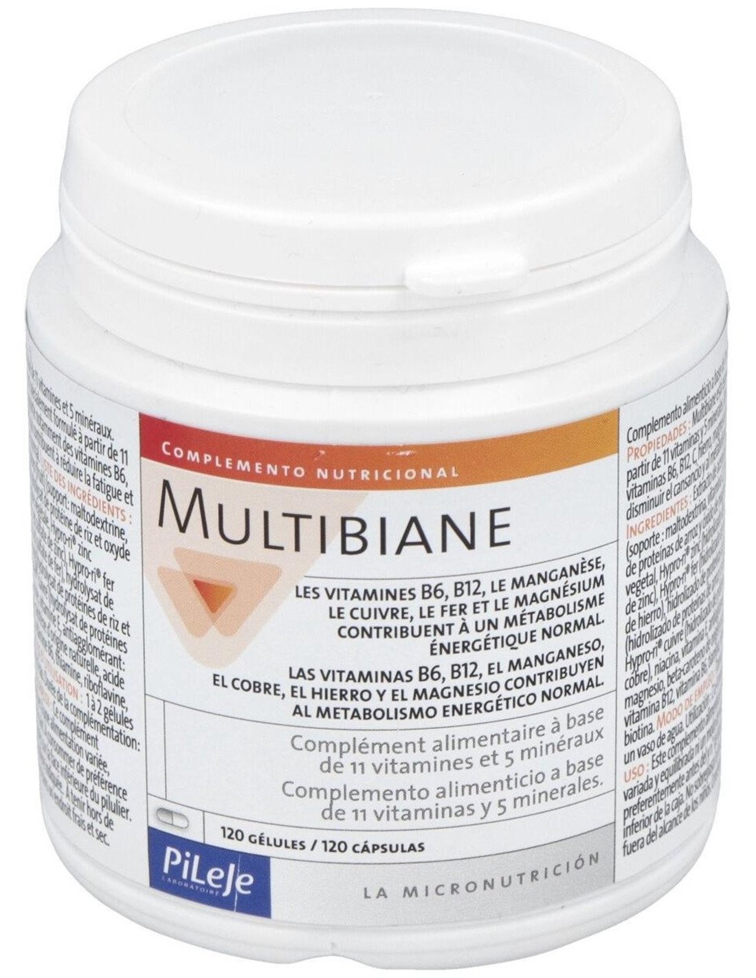 PILEJEMULTIBIANE | Multibiane 120cápsSituaciones como las dietas de adelgazamiento, una alimentación inadecuado o una sobrecarga de trabajo intelectual pueden ser causas de desequilibrio de vitaminas y minerales.Multibiane es un complemento alimenticio que aporta 11 vitaminas y minerales para contribuir al funcionamiento óptimo del sistema inmunitario (vitaminas A, B6, B12 y C) y ayuda a la reducción del cansancio (vitaminas C, B6, B12, folatos, niacina y magnesio).
