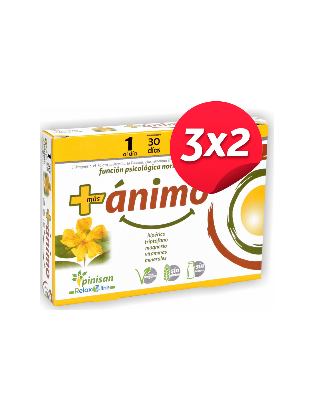 Descubre el Pack 3x2 Mas Animo, 30 Cáps. de Pinisan, una solución increíble diseñada para brindarte un impulso de energía y bienestar de forma instantánea. Este exclusivo pack te ofrece tres unidades por el precio de dos, una oportunidad única para cuidar tu salud y mantener tu ánimo en alto sin gastar de más.