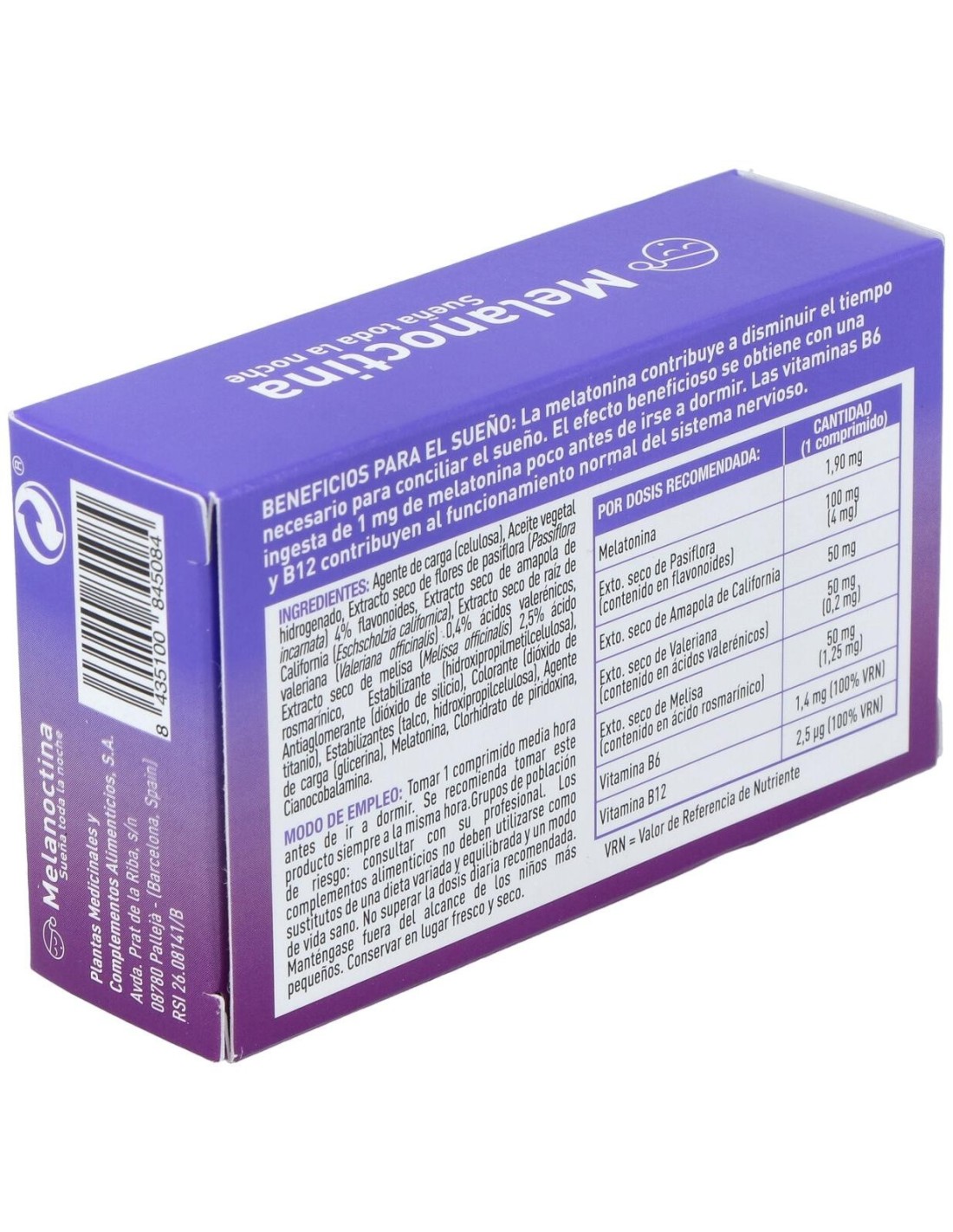 Ingredientes:Agente de carga (celulosa), Aceite vegetal hidrogenado, Extracto seco de flores de pasiflora (Passiflora incarnata) 4% flavonoides. Extracto seco de amapola de California (Eschscholzia californica), Extracto seco de raíz de valeriana (Valeriana officinalis) 0,4% ácidos valerénicos, Extracto seco de melisa (Melissa officinalis) 2,5% ácido rosmarínico, Estabilizante (hidroxipropilmetilcelulosa), Antiaglomerante (dióxido de silicio), Colorante (dióxido de titanio), Estabilizantes (talco, hidroxipropilcelulosa), Agente de carga (glicerina), Melatonina, Cloridrato de piridoxina, Cianocobalamina.Modo de empleo:Toma 1 comprimido al día media hora antes de ir a dormir. Aunque Melanoctina es segura para la mayoría, recomendamos consultar a un médico si estás embarazada, en periodo de lactancia o tomando medicamentos. Evita su uso junto con sedantes para prevenir excesiva somnolencia.Presentación:Envase de 30 comprimidos.