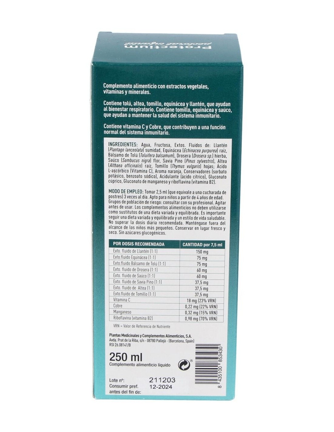 Ingredientes:Agua, Fructosa, Extos. Fluidos de: Llantén (Plantago lanceolata) sumidad, Equinácea (Echinacea purpurea) raíz, Bálsamo de Tolú (Toluifera balsamum), Drosera (Drosera sp.) hierba, Saúco (Sambucus nigra) flor, Savia Pino (Pinus sylvestris), Altea (Althaea officinalis) raíz, Tomillo (Thymus vulgaris) hojas; Ácido L-ascórbico (Vitamina C), Aroma naranja, Conservadores (sorbato potásico, benzoato sódico), Acidulante (ácido cítrico), Gluconato cúprico, Gluconato de manganeso y Riboflavina (vitamia B2).Modo de empleo:Tomar 2,5 ml 3 veces al día. Apto para niños a partir de 6 años de edad.Presentación:Envase de 250 ml.