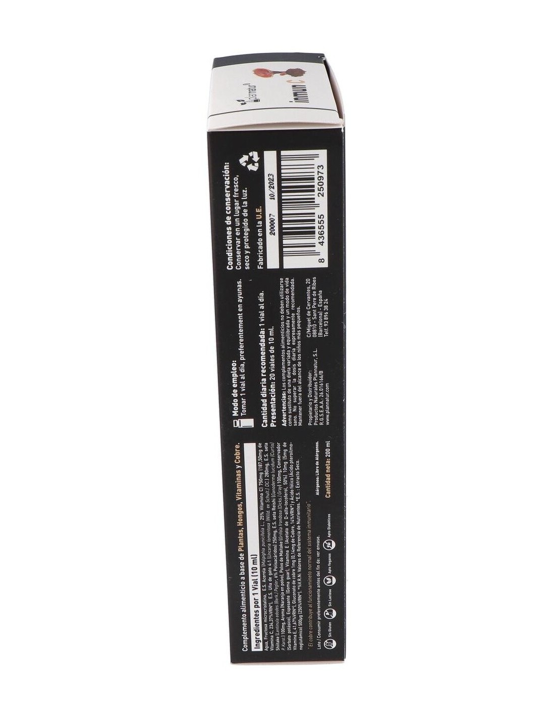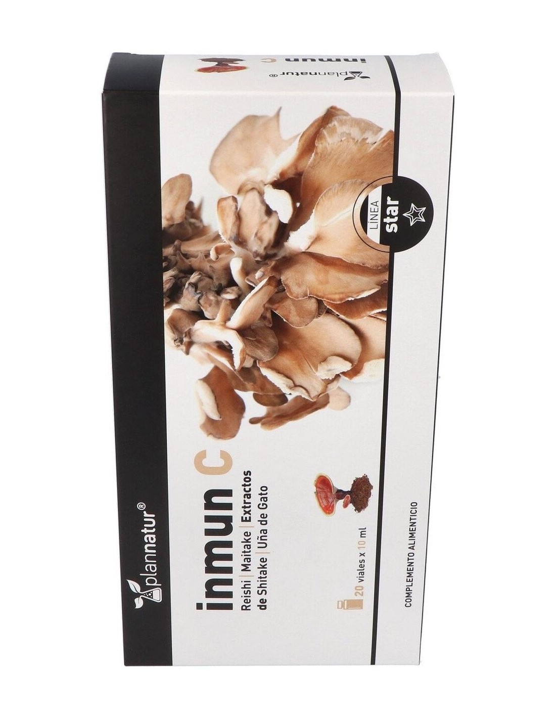 Complemento alimenticio en forma de ampollas bebibles, elaborado a base de extractos de la planta """"uña de gato"""" y de hongos reishi, shiitake y maitake, además de vitamina C y cobre, que contribuye a estimular y reforzar las defensas del sistema inmunitario. Contiene además vitamina B9, que ayuda a disminuir la sensación de cansancio.