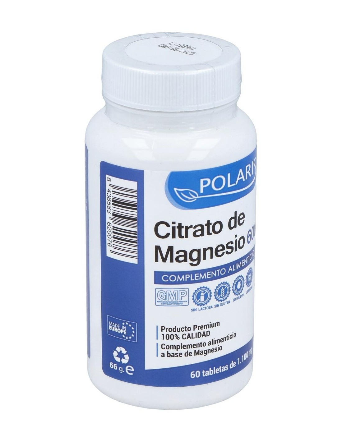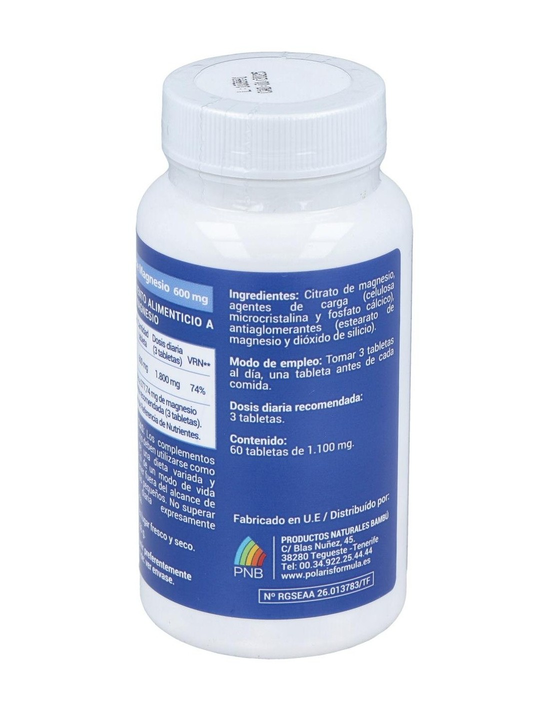 POLARISComposición activa por comprimido:600 mg de citrato de magnesio.Ingredientes:Citrato de magnesio, agentes de carga (celulosa microcristalina, fosfato