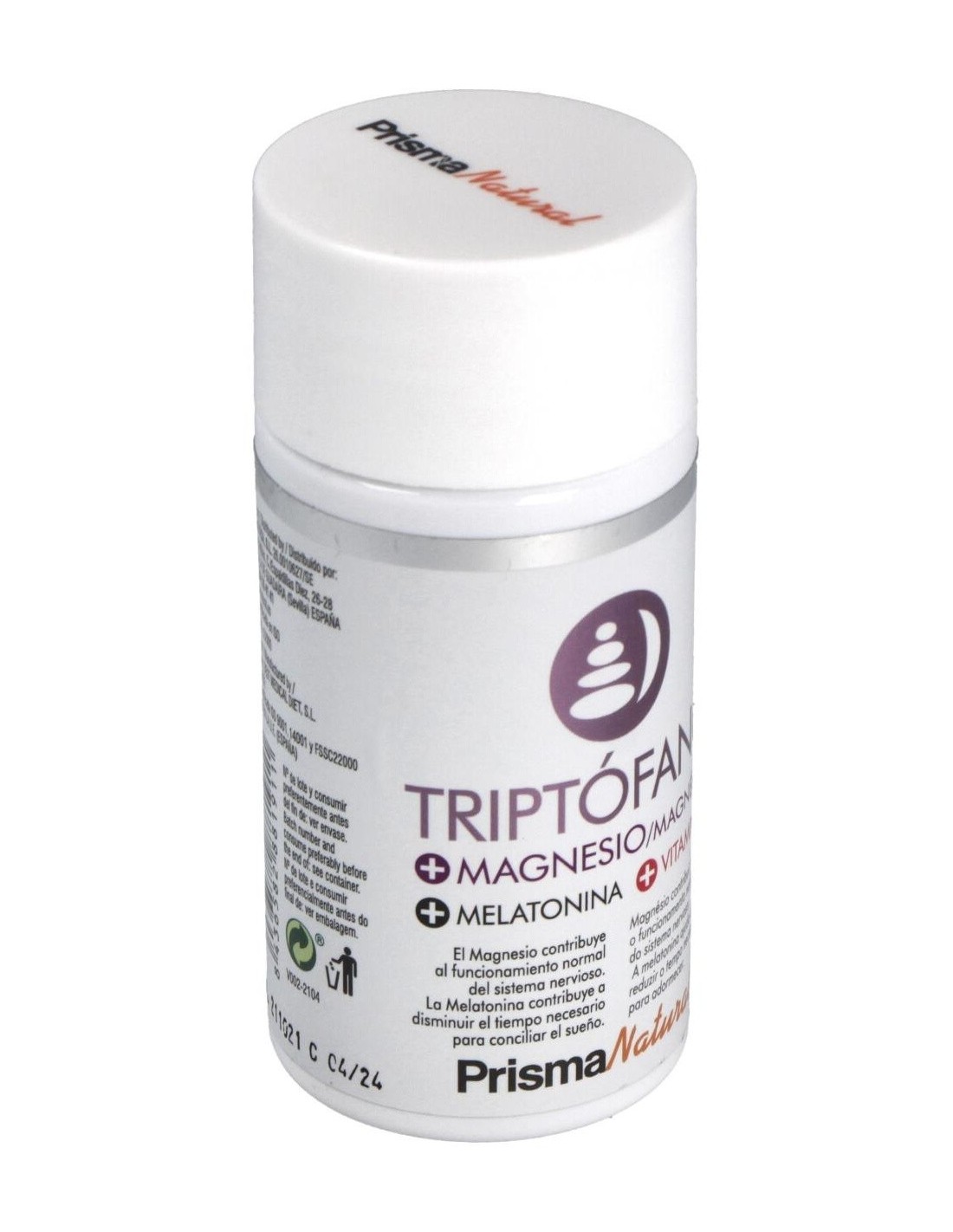 PRISMA NATURALEl Triptofano+Mg+Melatonina+Vitaminas 60 Comprimidos de Prisma es un suplemento para adultos que ayuda a apoyar el bienestar nocturno mediante una combinación de triptófano, magnesio, melatonina y vitaminas.