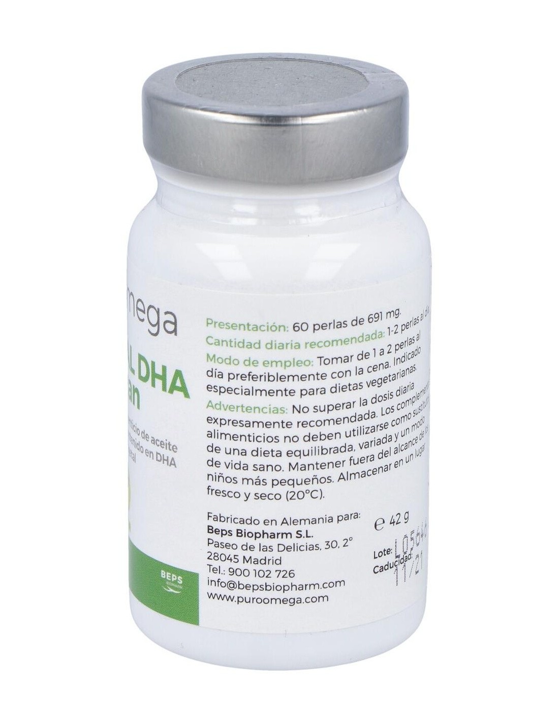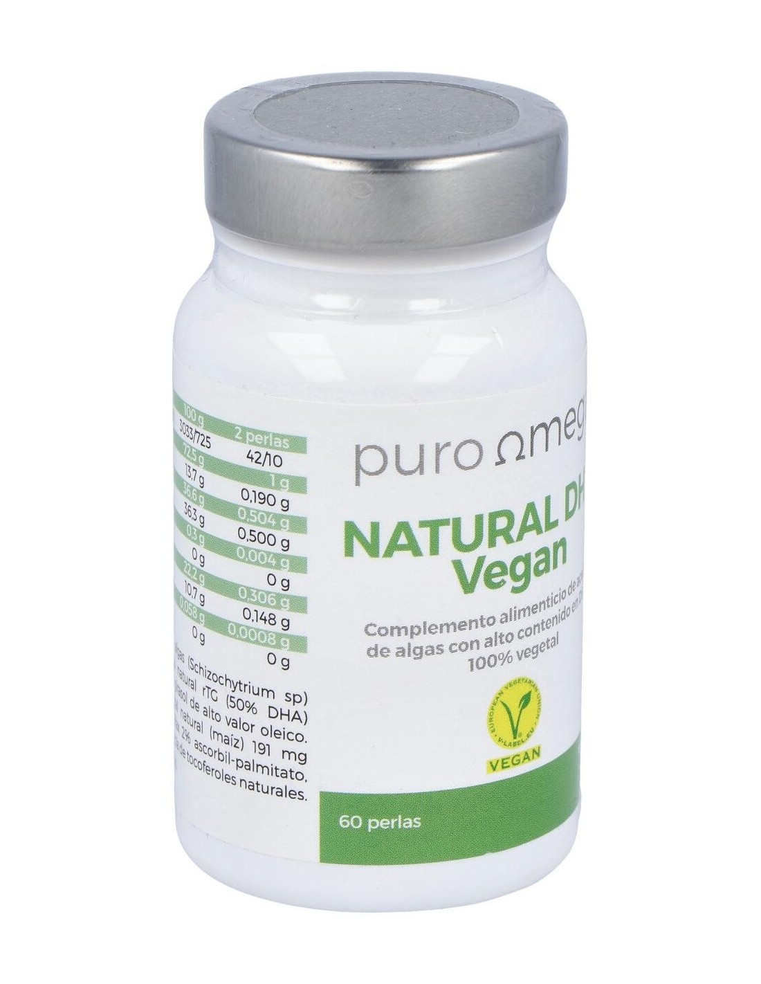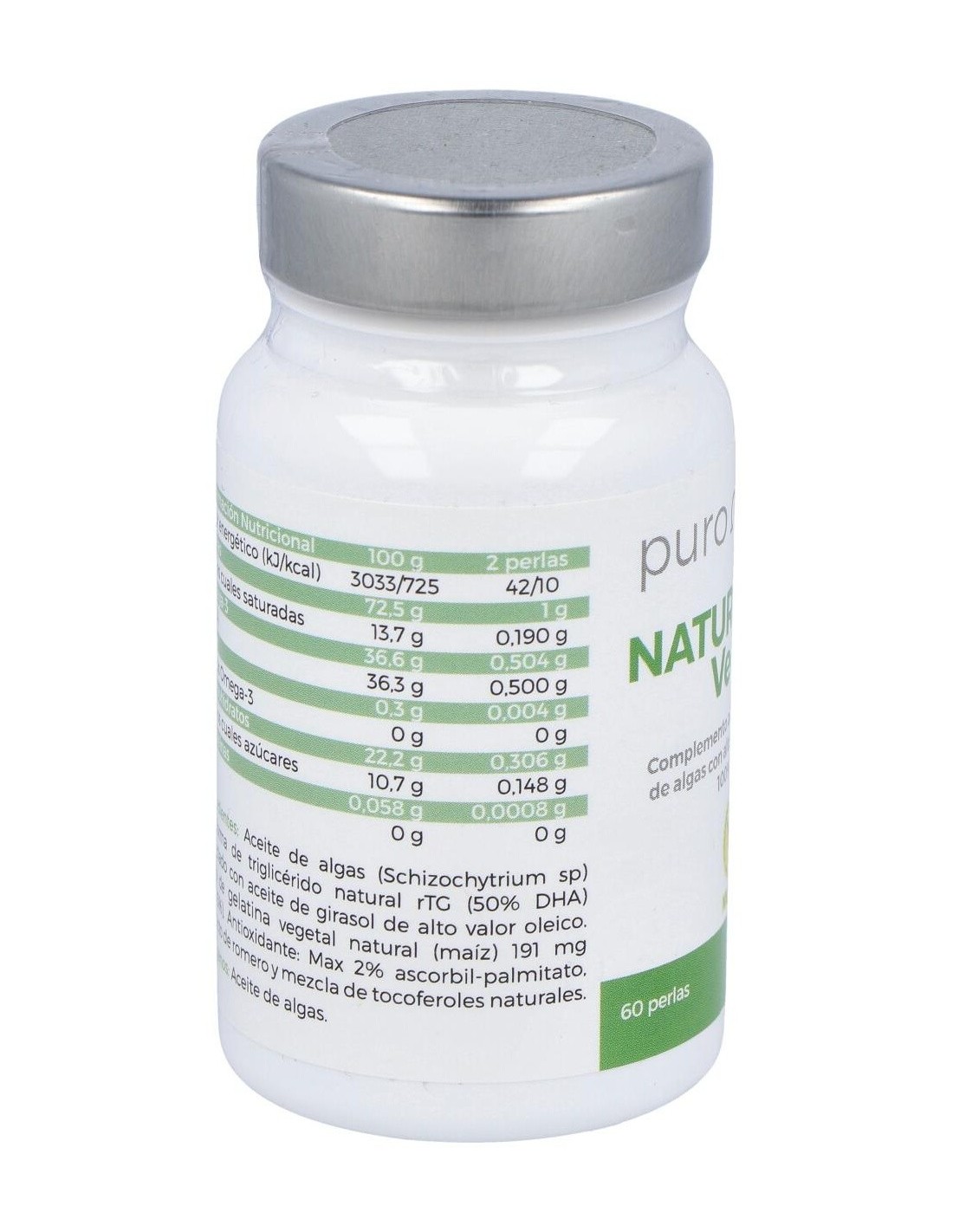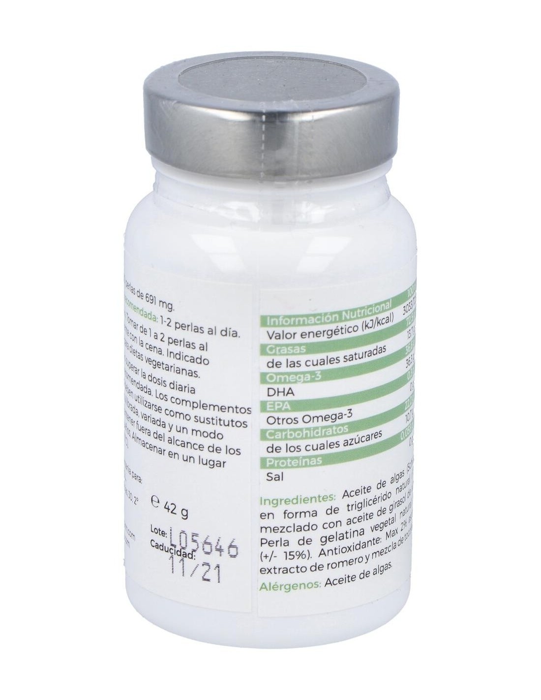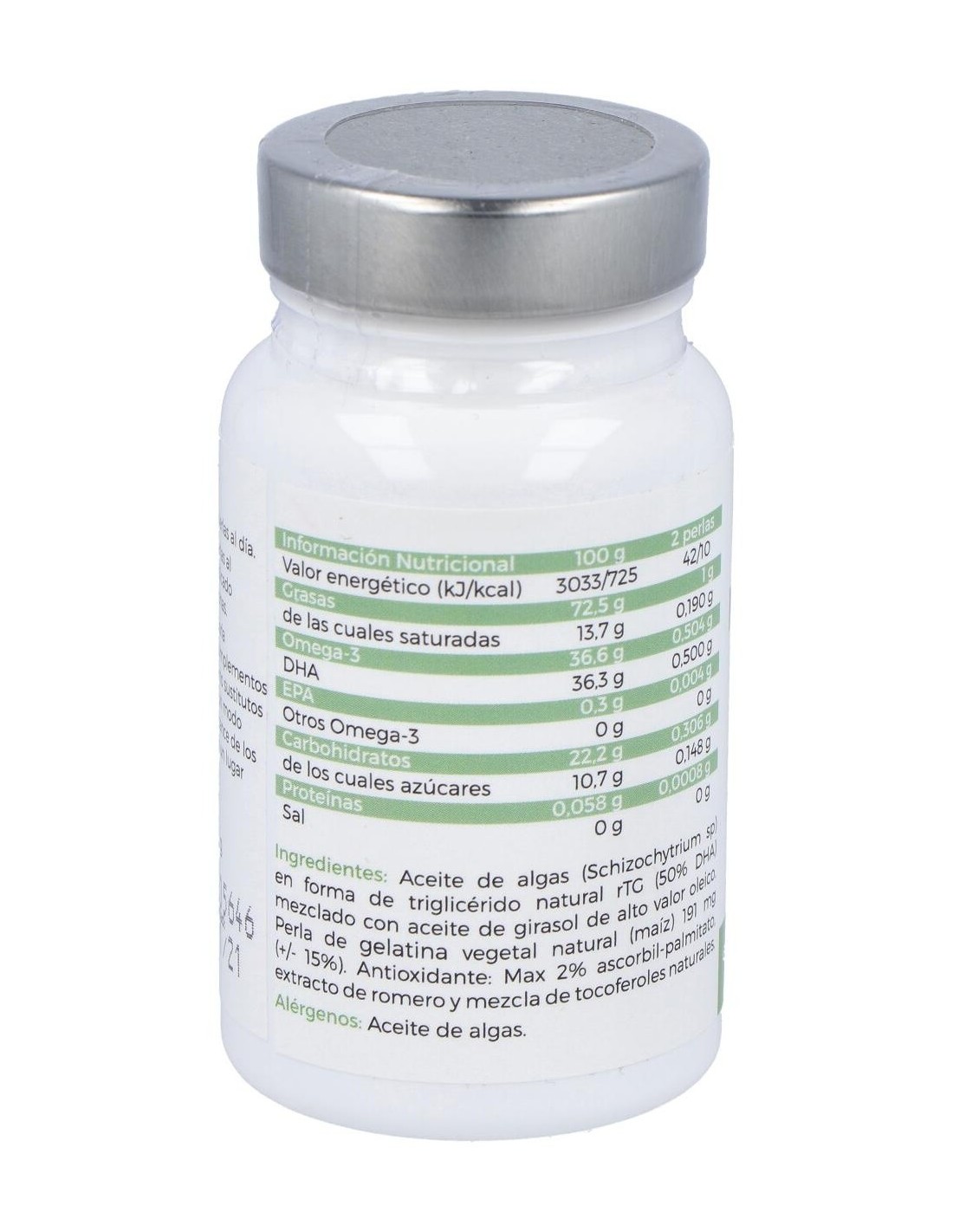 Aceite de algas (Schizochytrium sp) en forma de triglicérido natural rTH (50%) mezclado con aceite de girasol de alto valor oleico. Perla de Gelatina vegetal natural (maíz) 191 mg (+-15%). Antioxidante más 2% ascorbil-palmitato, extracto de romero y mezcla de tocoferoles naturales.
