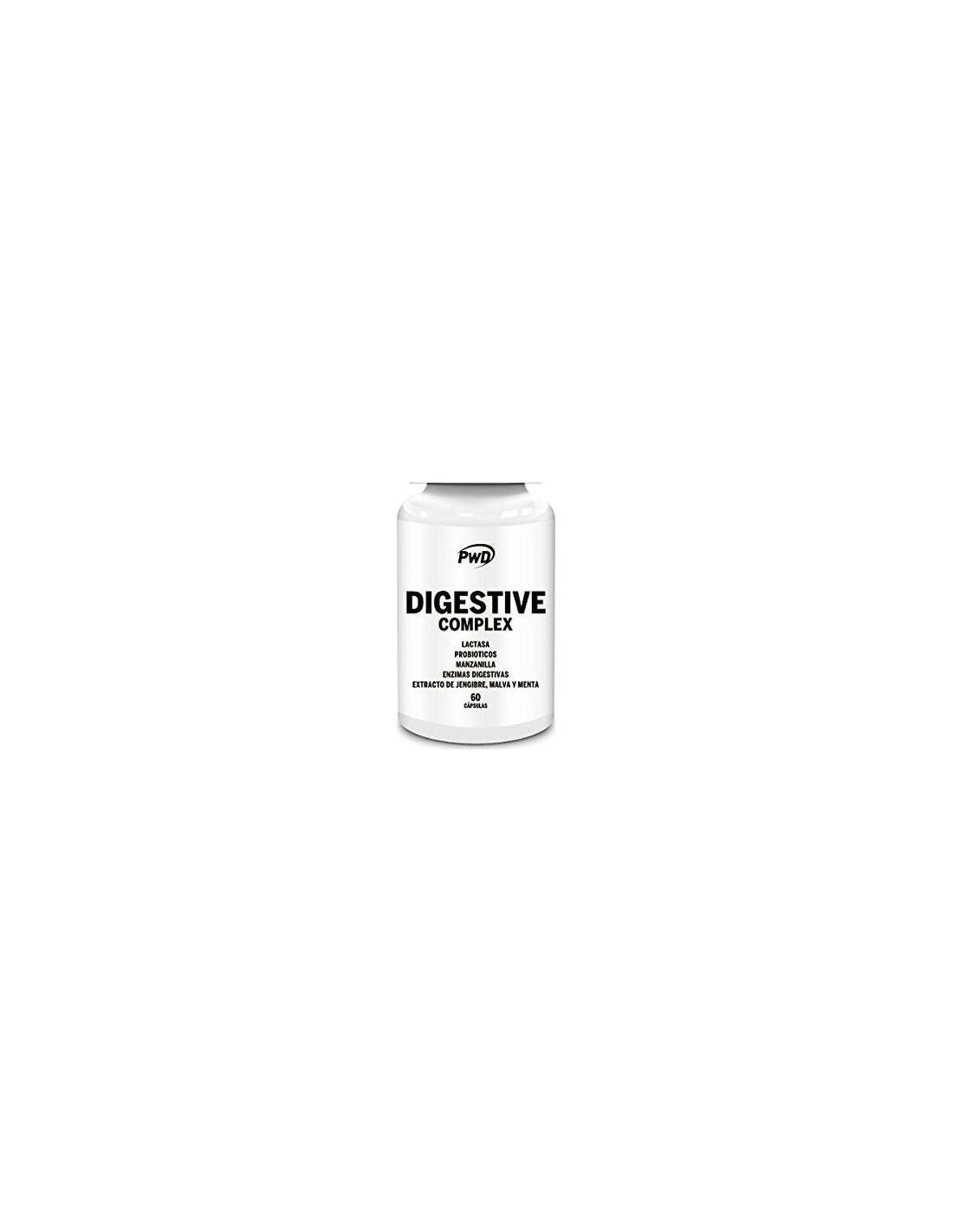 PWDDigestive Complex 60Cap. de Pwd es un suplemento digestivo para adultos que apoya la salud gastrointestinal mediante una fórmula equilibrada de enzimas y probióticos.