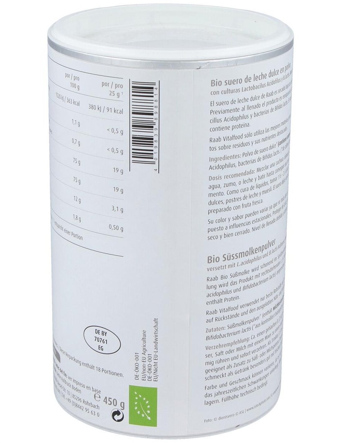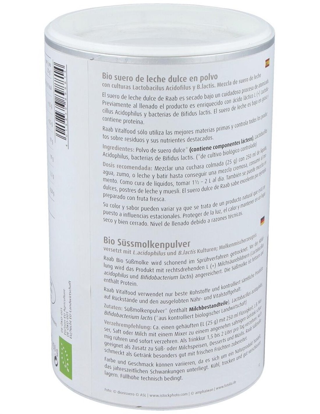 RAAB VITALFOODSuero de leche dulce secado bajo un cuidadoso proceso de atomizado. Previamente al llenado el producto es enriquecido con ácido láctico L(+) Lactobacillus Acidophilus y bacterias de Bifidus lactis.