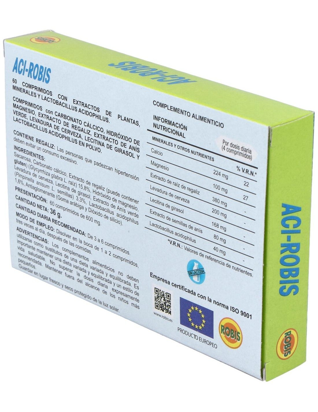 Sacarosa, Carbonato Cálcico, Extracto seco de raíz de Regaliz (Glycyrrhiza Glabra L.), Hidróxido de Magnesio, Levadura De Cerveza, Lecitina de Girasol, Extracto seco de semillas de Anís Verde (Pimpinella Anisum L.), Lactobacillus Acidophilus, Antiaglomerantes (Goma Arábiga, Dióxido de Silicio).
