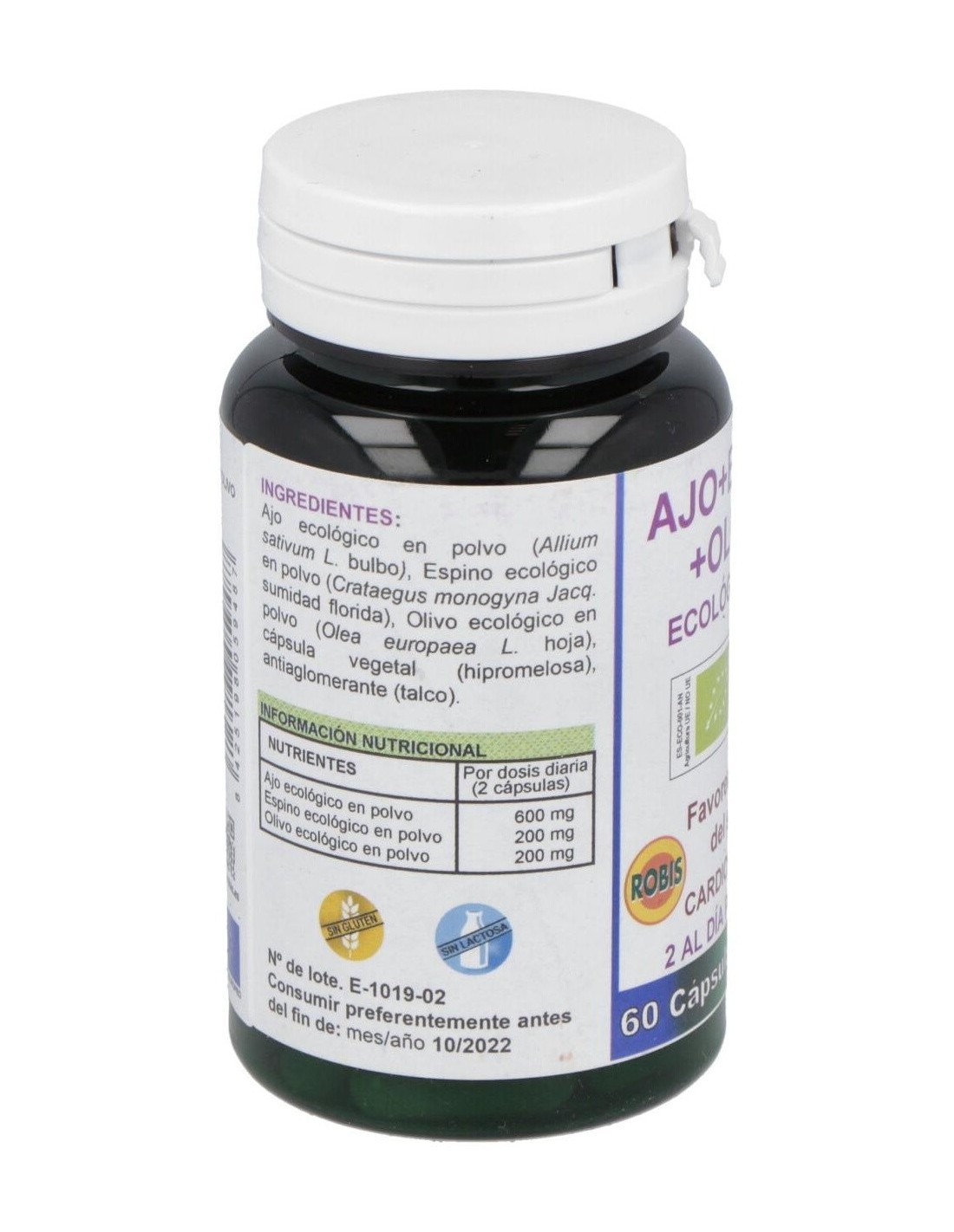 ROBISEl Ajo-Espino-Olivo 60Cap. Eco de Robis es un suplemento natural para adultos que busca apoyar el bienestar cardiovascular mediante una fórmula combinada de ajo, espino y olivo.