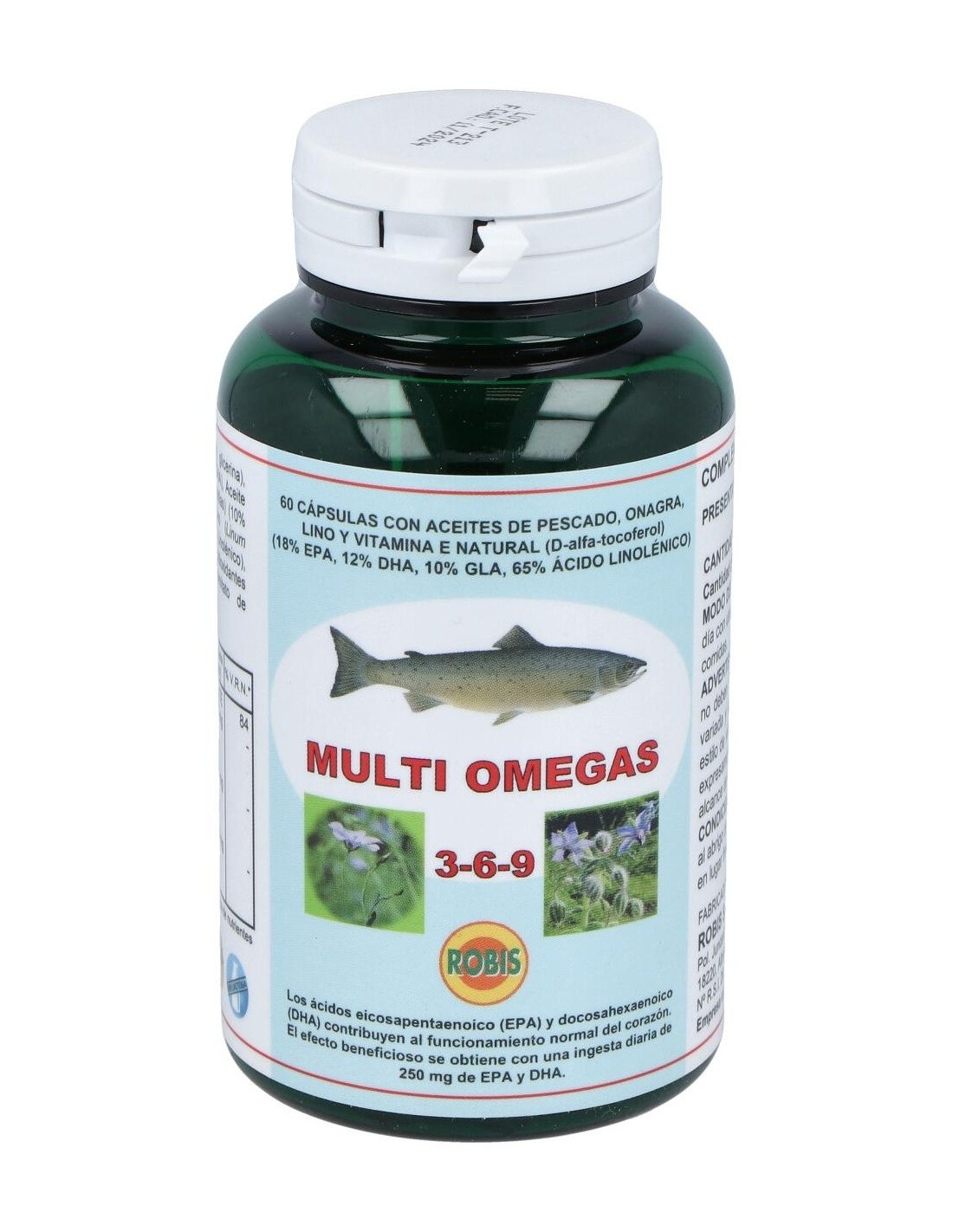 ROBISEl Multi Omega 3-6-9 60Cap. de Robis es un suplemento nutricional para adultos que aporta ácidos grasos esenciales, contribuyendo al bienestar general mediante una fórmula equilibrada de omega 3, 6 y 9.