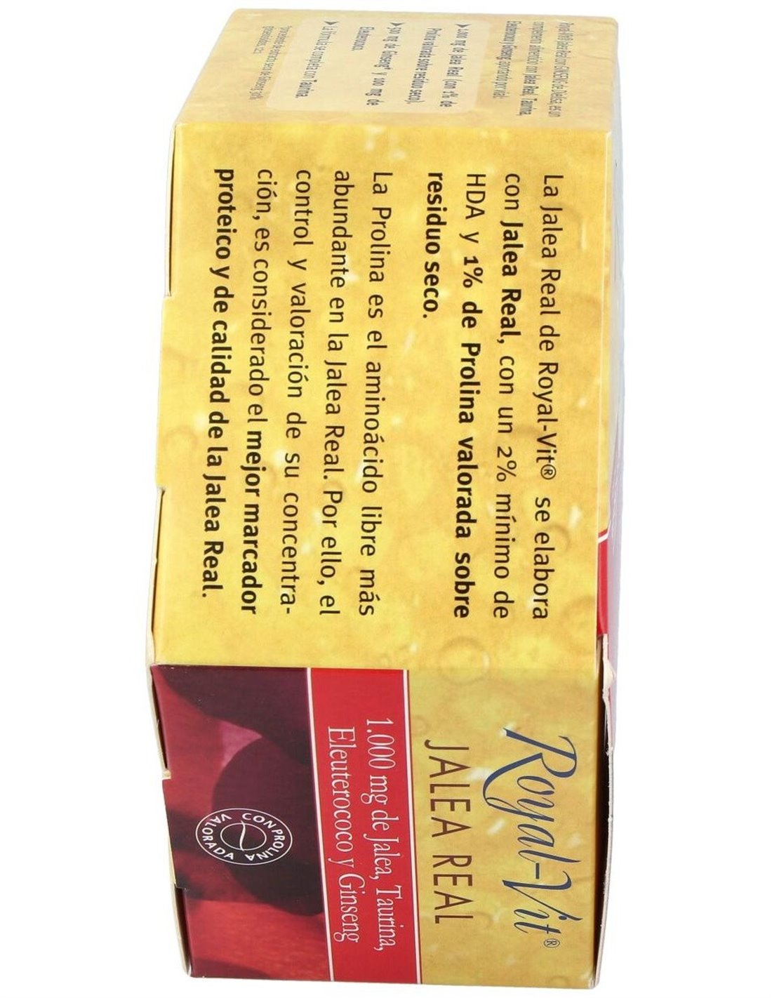 ROYAL-VIT®Complemento alimenticio que gracias a que contiene jalea real, taurina, eleuterococo y ginseng promueve la vitalidad, favorece la resistencia y ayuda a mantener unas buenas relaciones sexuales.La jalea esuna buena fuente de vitaminas del grupo B, tales como la tiamina (B1), riboflavina (B2), niacina (B3), ácido pantoténico (B5), piridoxina (B6), inositol y ácido fólico, vitaminas implicadas en numerosos procesos metabólicos del organismo.