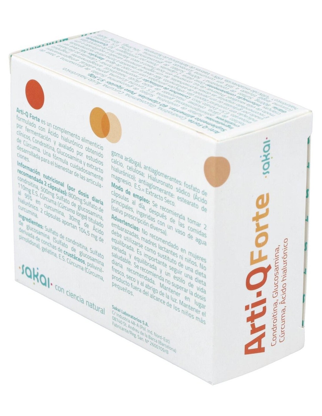 SAKAISakai Arti-Q Forte 60 Cápsulas es un complemento alimenticio a base de condroitina, glucosamina, cúrcuma, ácido hialurónico que contribuye a aumentar la movilidad articular y disminuye las molestias de las articulaciones. Consejo FarmacéuticoLa cúrcuma es una raíz usada en polvo que pertenece a la familia del jengibre.