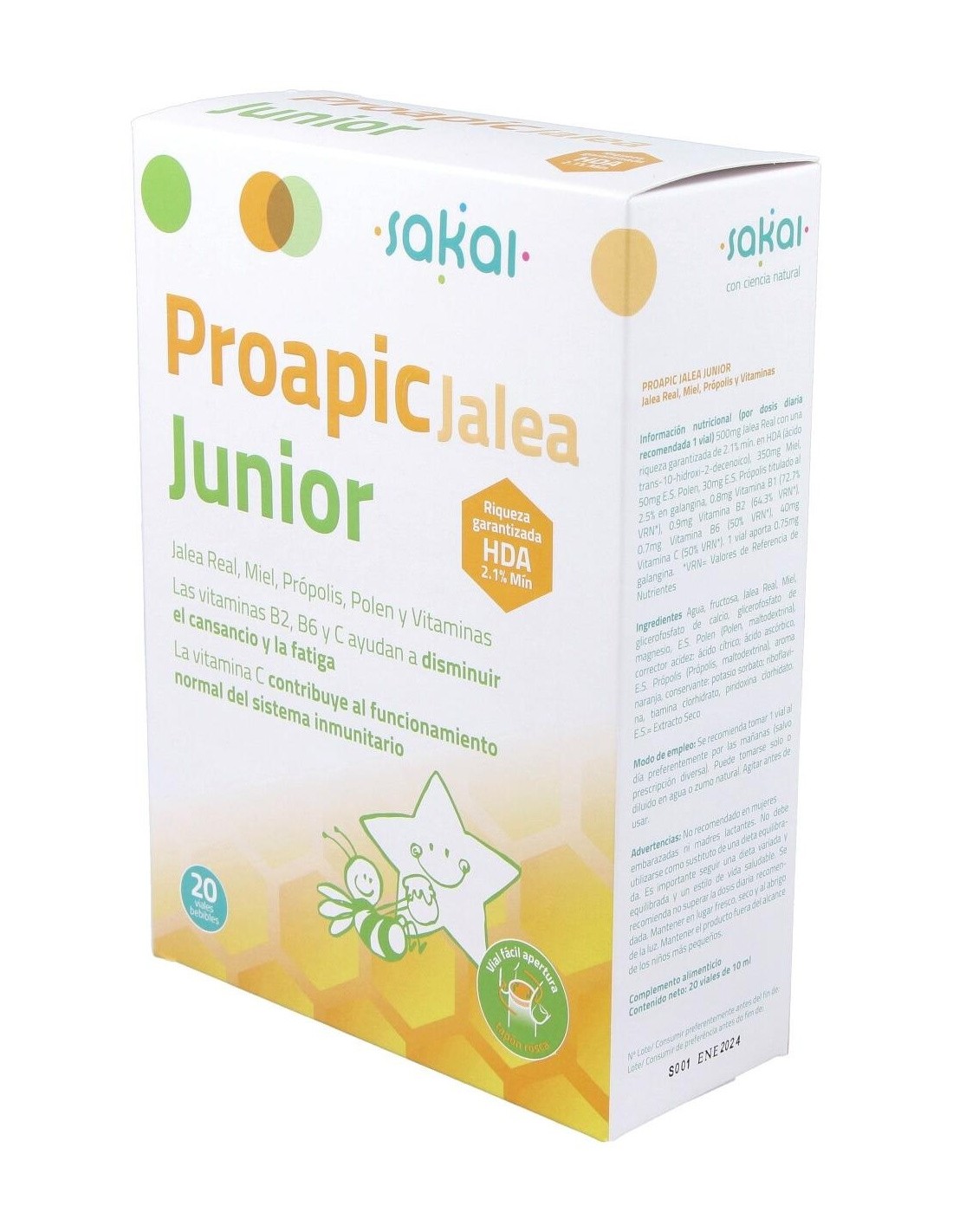- Contiene jalea real en presentación de 20 ampollas, facilitando una dosificación práctica y adecuada para el consumo infantil y juvenil.
