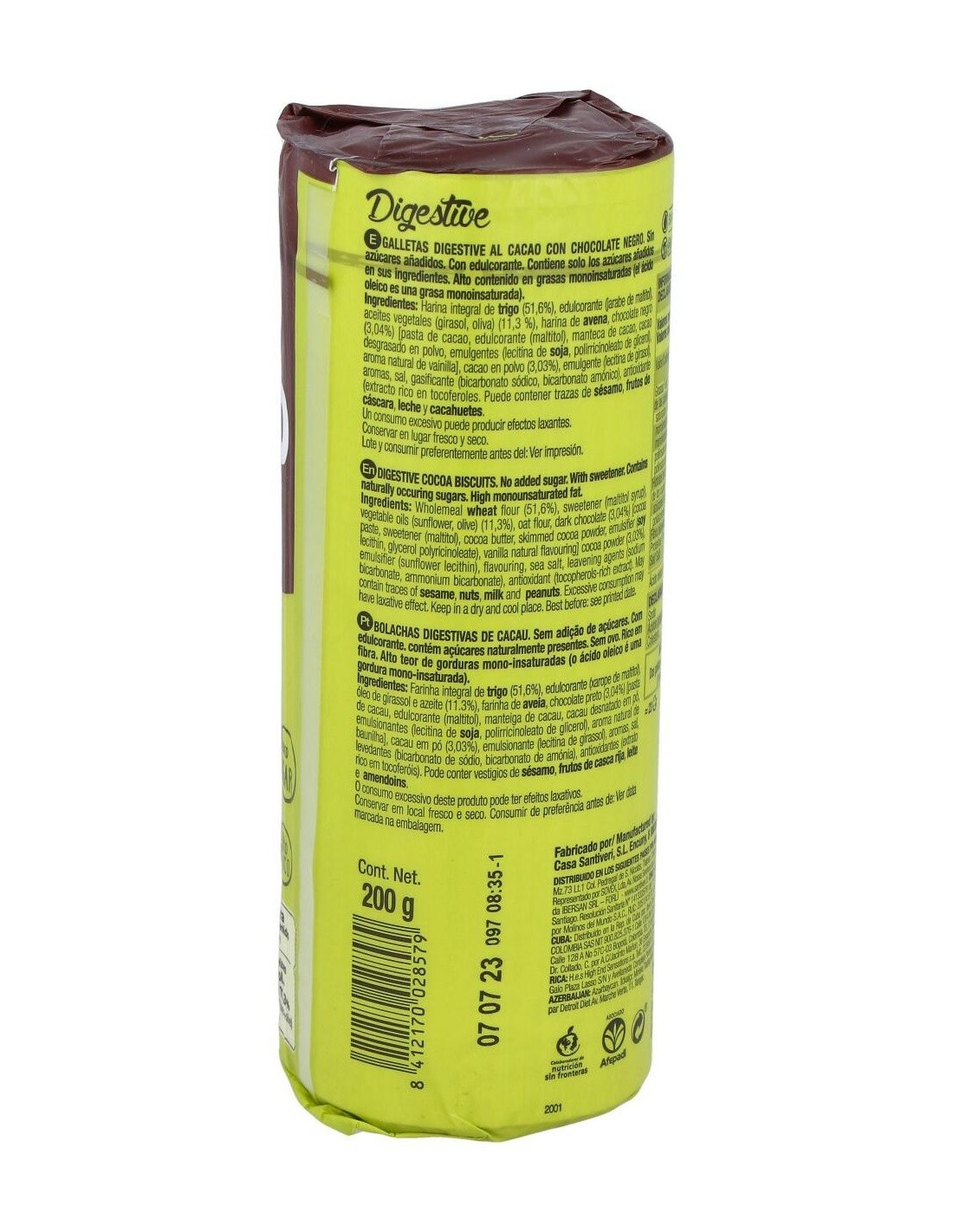 Harina integral de trigo (47.1%), edulcorante (maltitol, acesulfamo), grasa vegetal no hidrogenada (12.5%), cacao en polvo (5.5%), harina de avena, sal, emulgente (lecitina de soja), aromas, gasificantes (bicarbonato sódico, bicarbonato amónico), colorante (caramelo), antioxidante (extractos ricos en tocoferoles vitamina E-), ácido fólico.