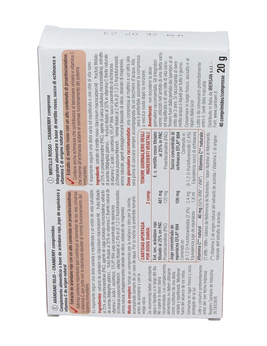 481 mg de extracto seco de arándano rojo titulado al 25% en PAC (proantocianidinas (PAC): 120 mg), 100 mg de jugo concentrado de equinácea (EFLA® 894) titulado al 2,4 % en 1,2-D-fructofuranósidos (1,2-D-fructofuranósidos: 2,4 mg) equivalentes a 1,8 ml de jugo fresco de equinácea, 40 mg (50% VRN) de Vitamina C natural procedente del extracto de acerola.