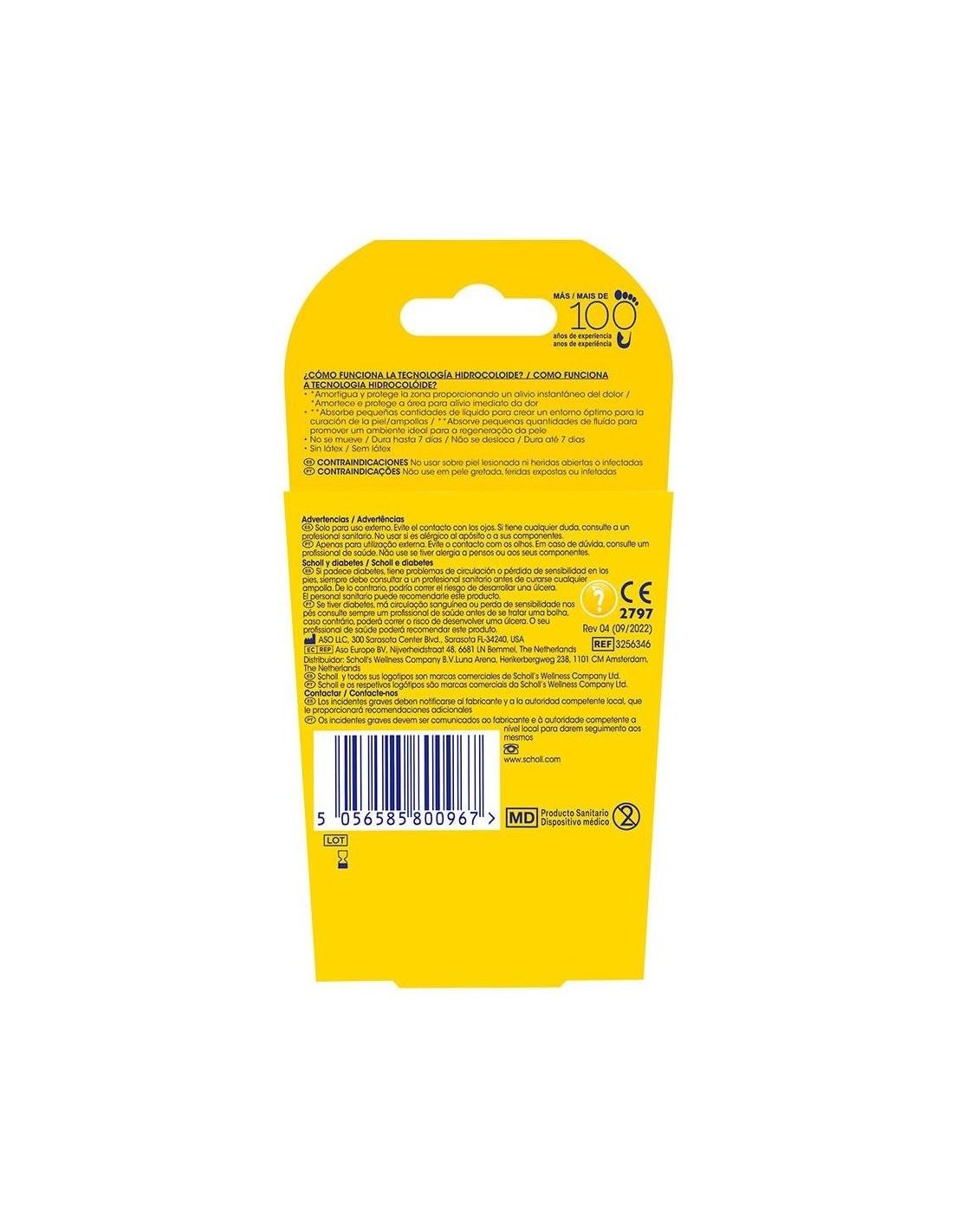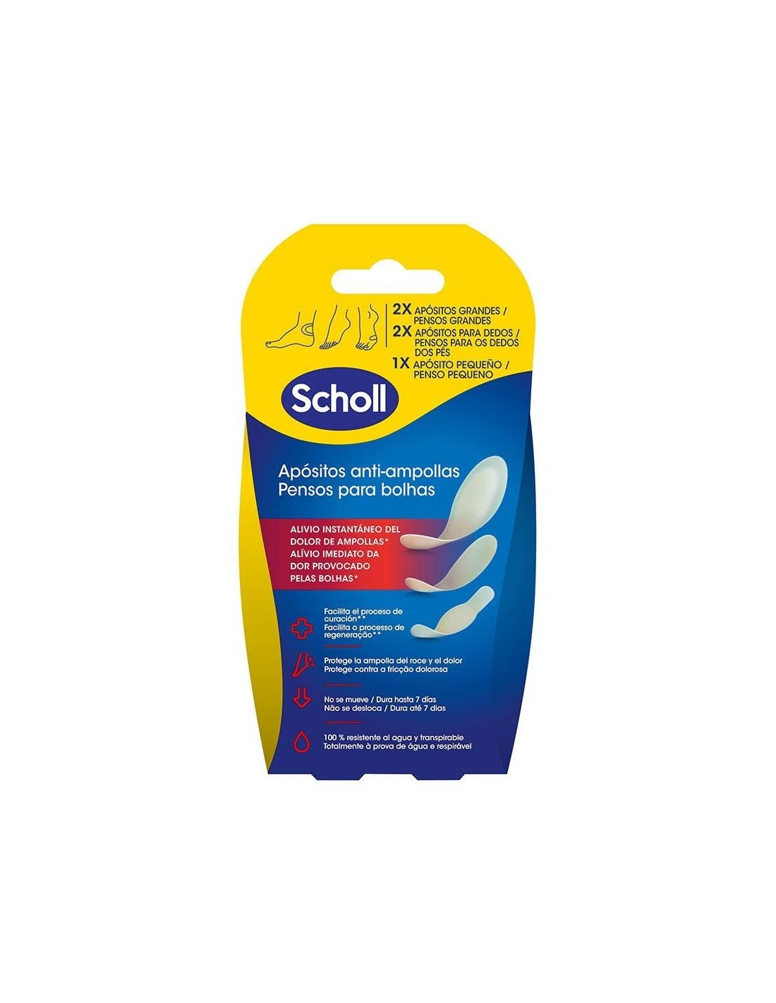 SCHOLLLos apósitos para ampollas Scholl alivian el dolor de inmediato, adaptándose perfectamente a la morfología del pie. La tecnología hidrocoloide permite una cicatrización más rápida al formar un gel alrededor de la zona y protegerla de contaminaciones externas. Los apósitos Scholl para ampollas son transpirables e impermeables, sin látex, lo que proporciona una mejor sujeción que los apósitos tradicionales. De esta manera, permanecen en su lugar hasta 7 días.\ \ Contiene: 2 apósitos grandes, 2 apósitos para dedos y 1 apósito pequeño.