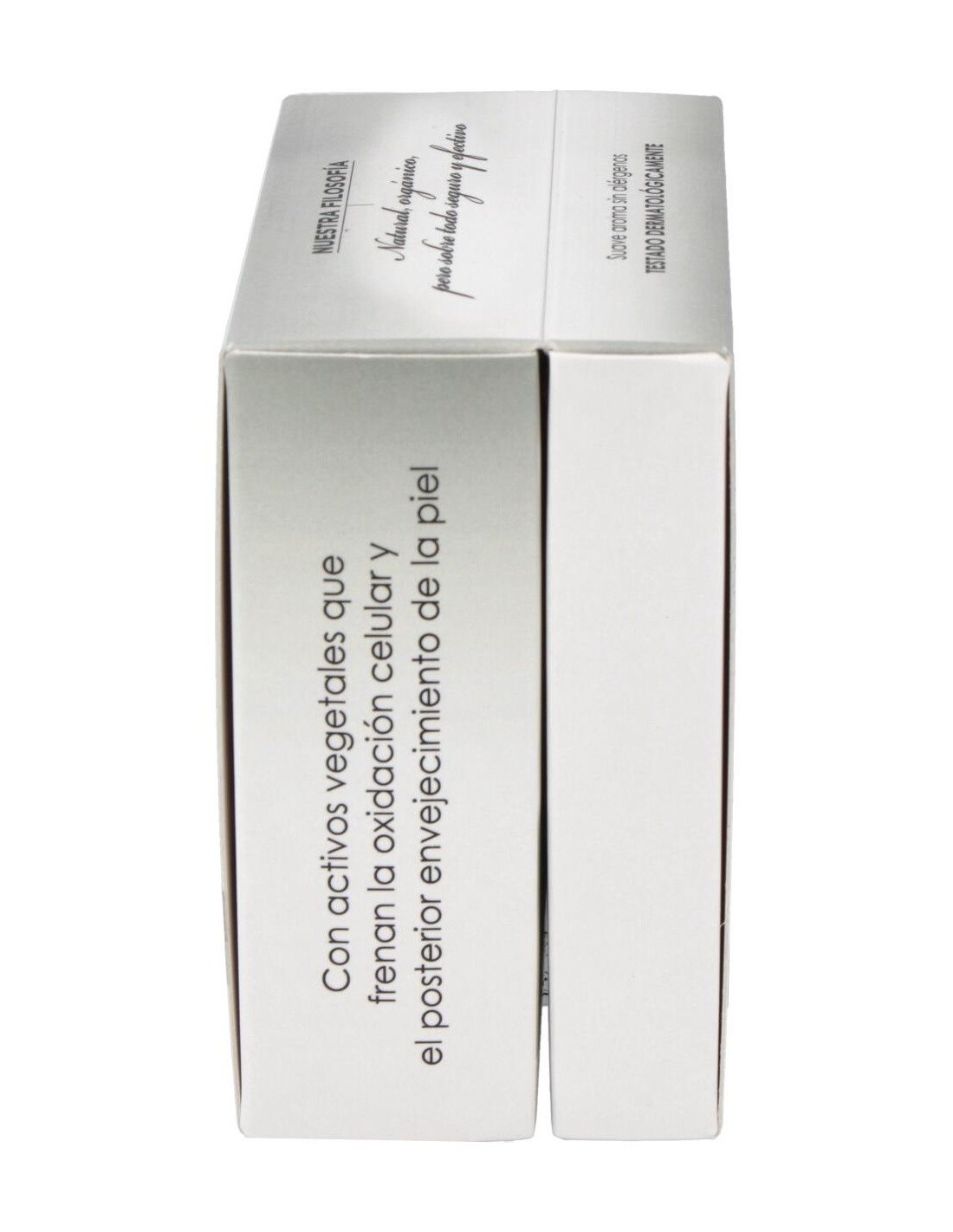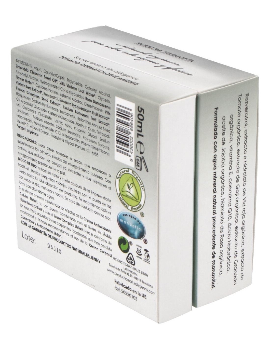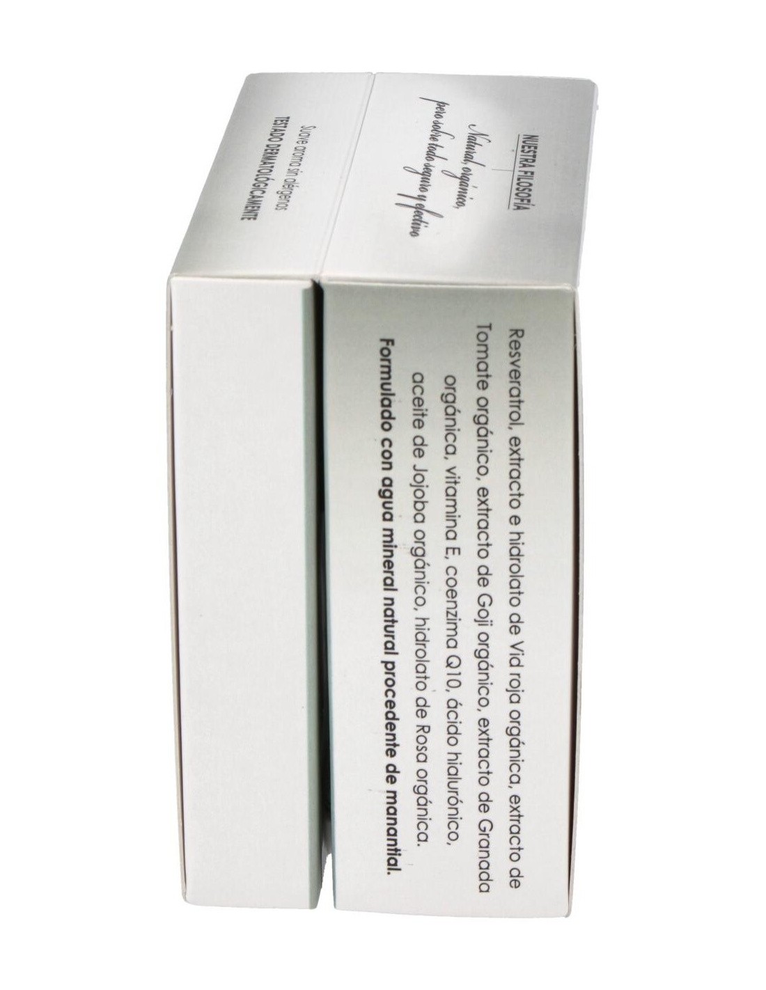 Crema especialmente diseñada para el cuidado antienvejecimiento e hidratante de la piel. Aporta hidratación y contribuye a minimizar las líneas de expresión y manchas oscuras. Elaborado a base de vitamina E, ayuda a disminuir cicatrices, imperfecciones y protege el cutis de los rayos solares. Contiene agua de manantial del Montseny, resveratrol, extracto de vid roja, tomate, bayas de goji, granada, coenzima Q10, ácido hialurónico y aceite de jojoba. Es rica en antioxidantes, adecuado como alternativa natural al bótox. Dermatológicamente probado. Indicado para todo tipo de piel.