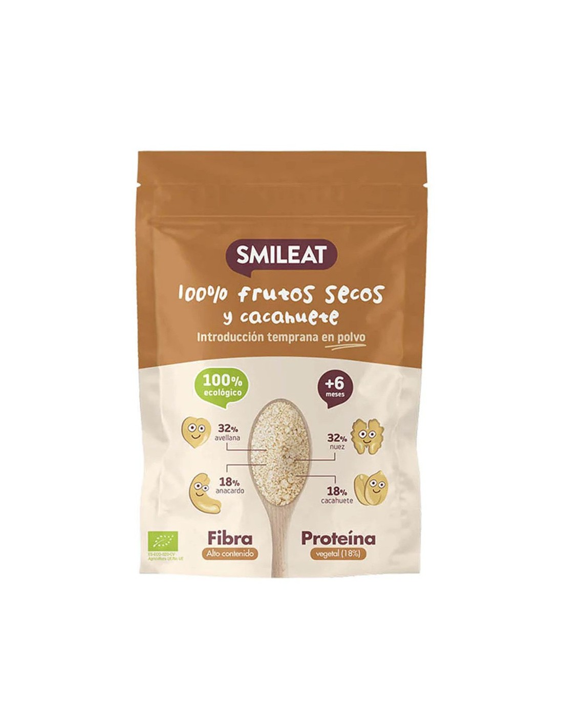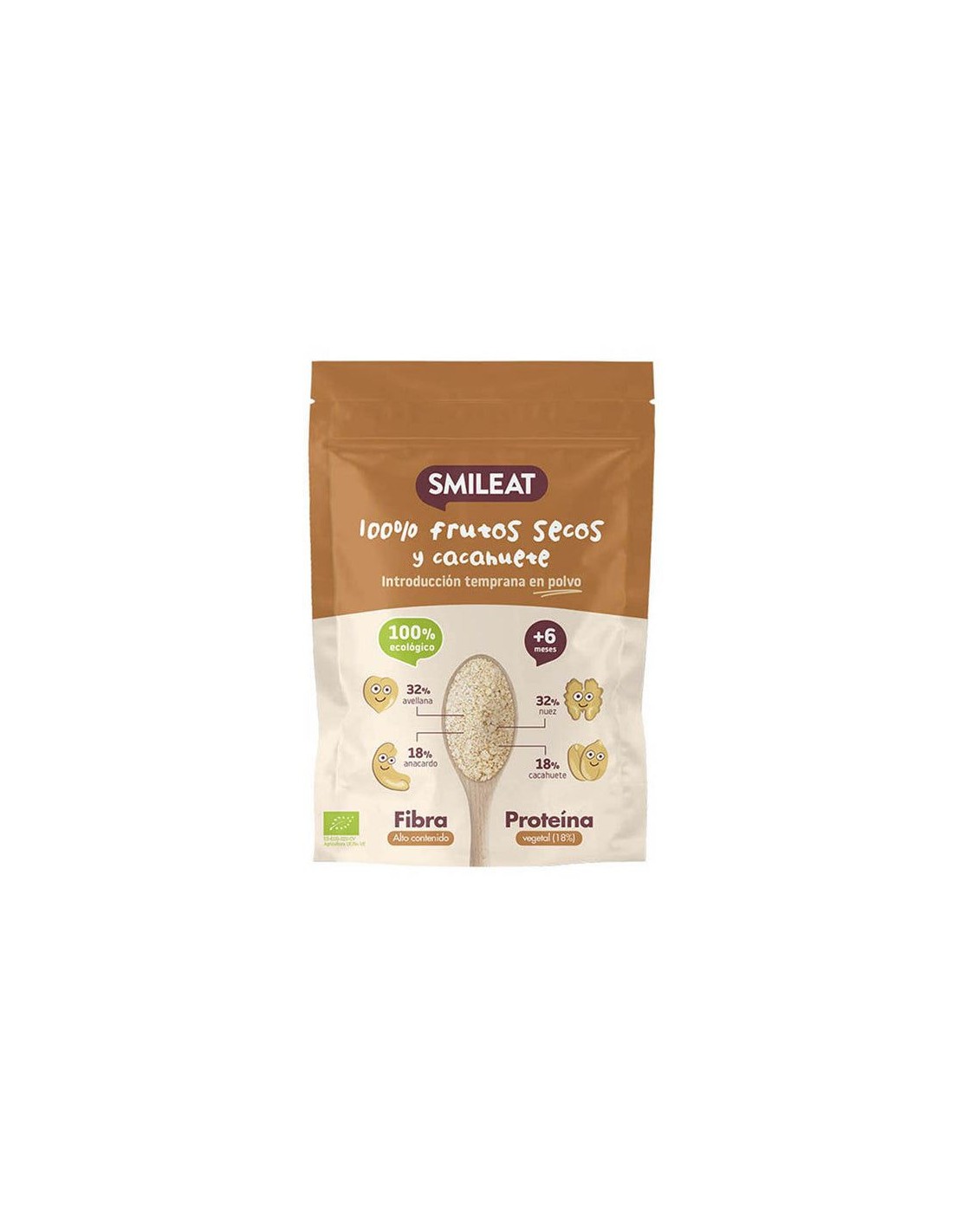 100% Frutos Secos y Cacahuete de Smileat, es una mezcla de diferentes frutos secos (avellana, anacardo y nuez) y cacahuetes, molida en polvo, sin tostar para su fácil consumo y evitar así el riesgo de atragantamiento asociado a los frutos secos y cacahuetes enteros. Es ideal para la introducción temprana en polvo.Ingredientes:Avellana* con piel 32%, nueces* con piel 32%, anacardo* repelado 18% y cacahuete* repelado 18%. (*) De producción ecológica.Valor nutricional por 100 gramos: