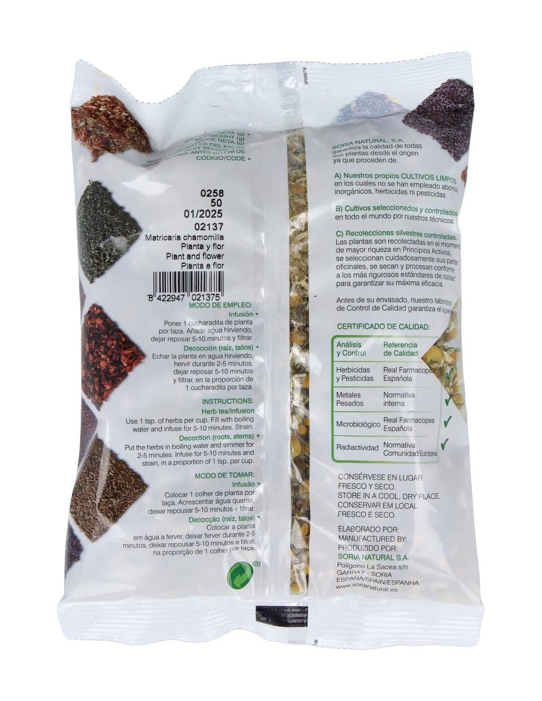 **Manzanilla Dulce Bolsa 50Gr. de Soria Natural** es una infusión elaborada con flores de manzanilla cuidadosamente seleccionadas, ideal para personas que buscan una opción natural para disfrutar de momentos de relajación y bienestar diario. Su presentación en bolsa facilita la preparación y dosificación precisa.