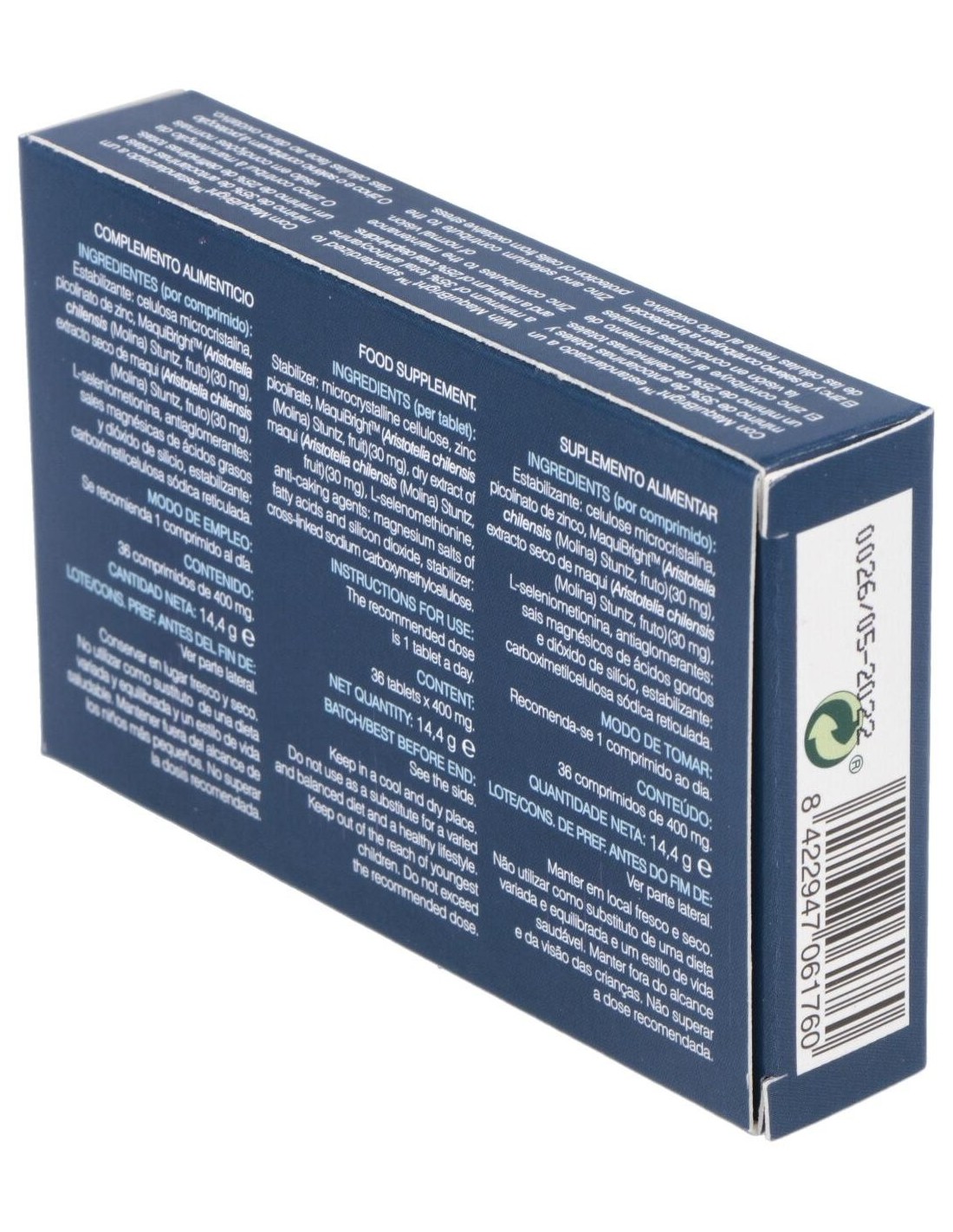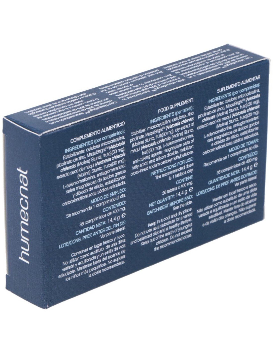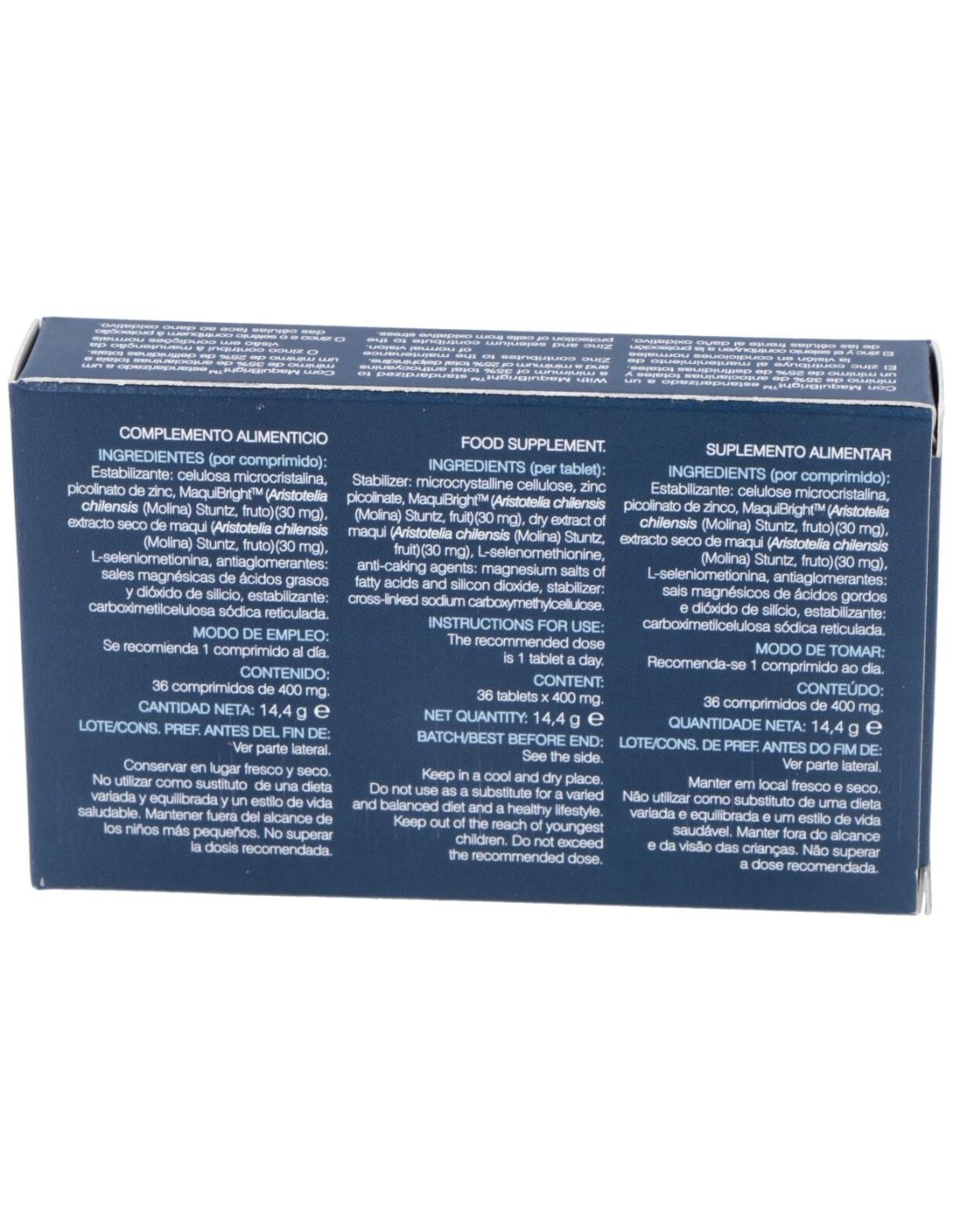 Estabilizante: celulosa microcristalina, picolinato de zinc, MaquiBrightTM (Aristotelia chilensis (Molina) Stuntz, fruto), extracto seco de maqui (Aristotelia chilensis (Molina) Stuntz, fruto), L-seleniometionina, antiaglomerantes: sales magnésicas de ácidos grasos y dióxido de silicio, estabilizante: carboximetilcelulosa sódica reticulada.