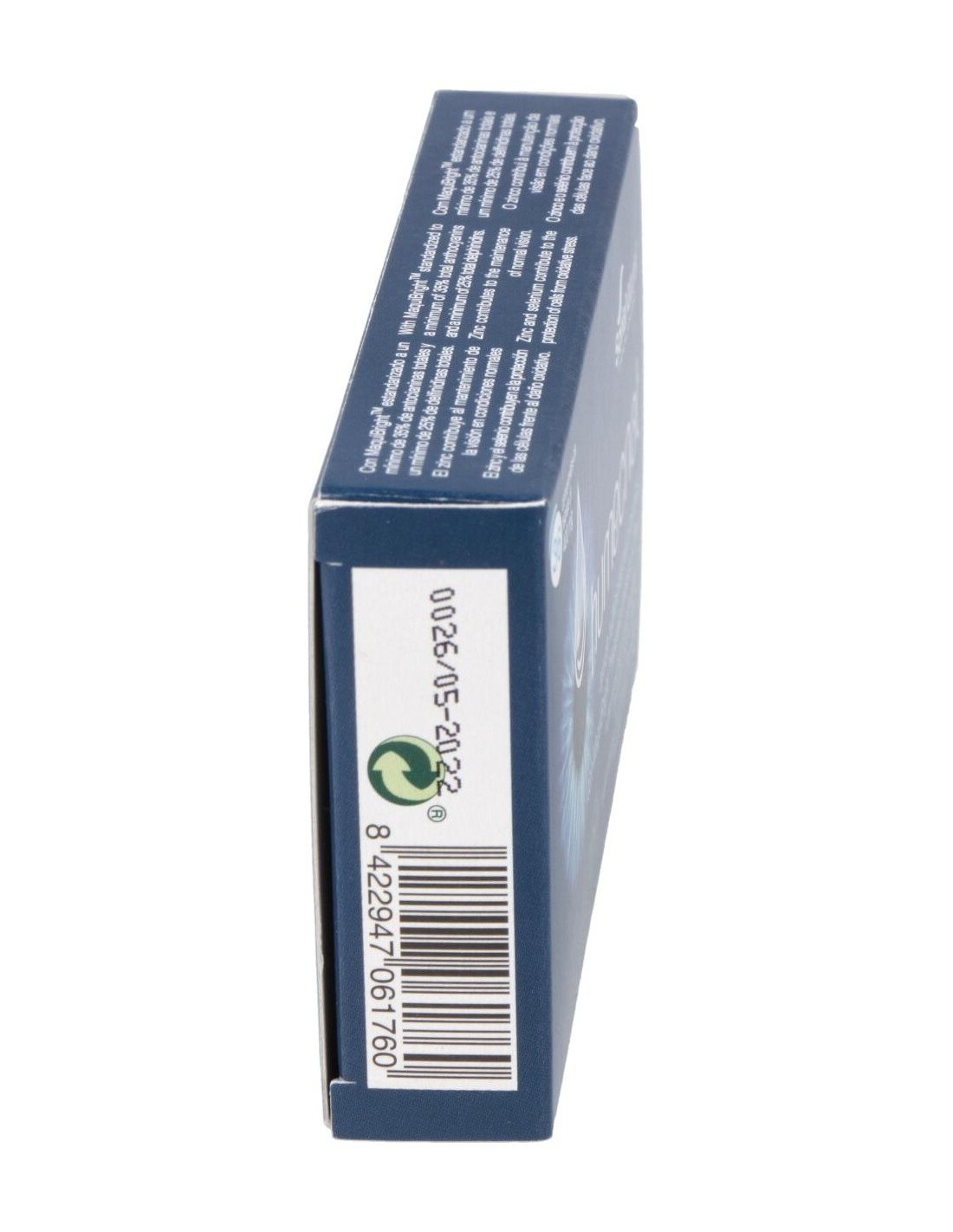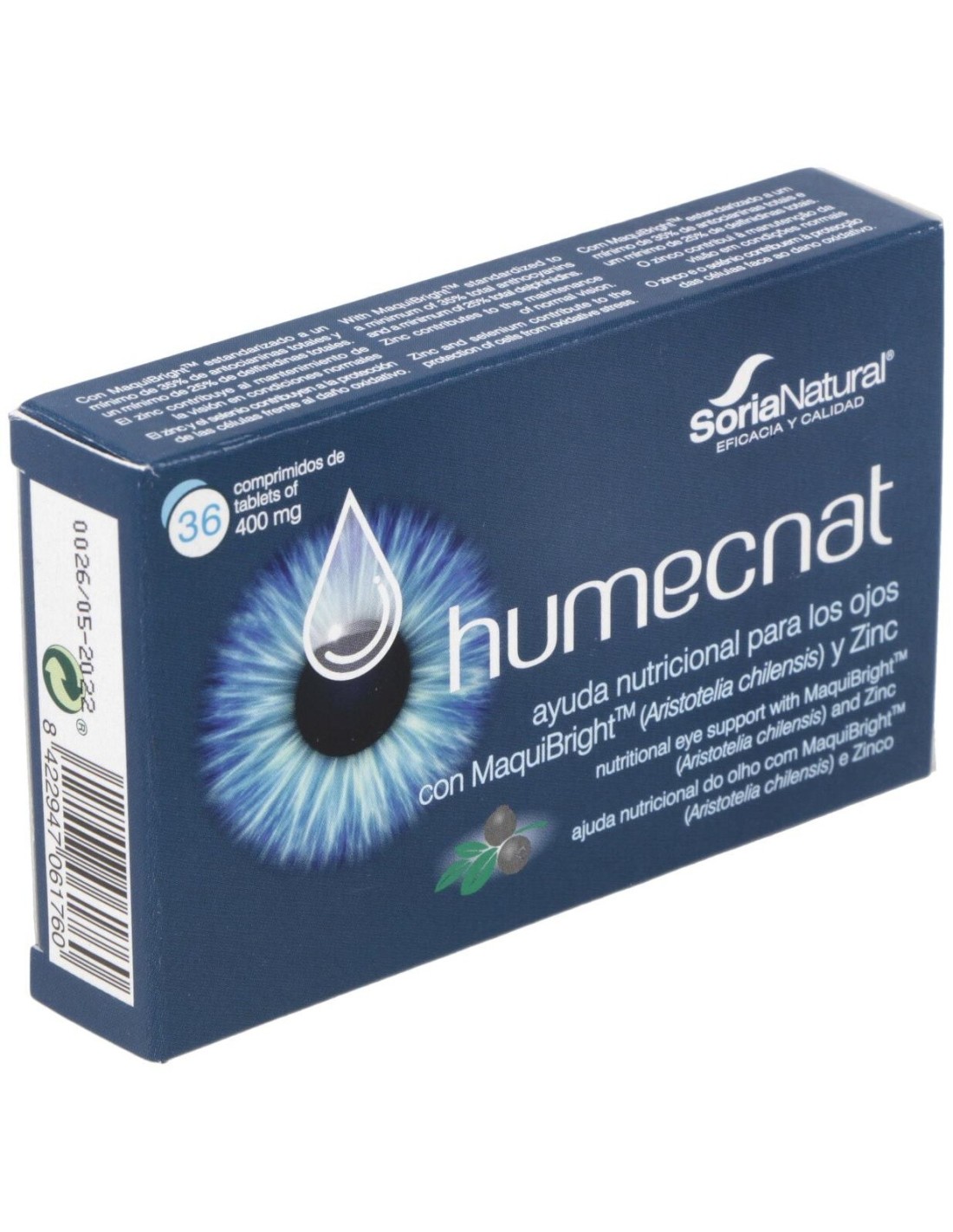 Complemento alimenticio con MaquiBrightTM (Aristotelia chilensis) y Zinc. Ayuda nutricional para los ojos. Especial ojos secos. El zinc contribuye al mantenimiento de la visión en condiciones normales.