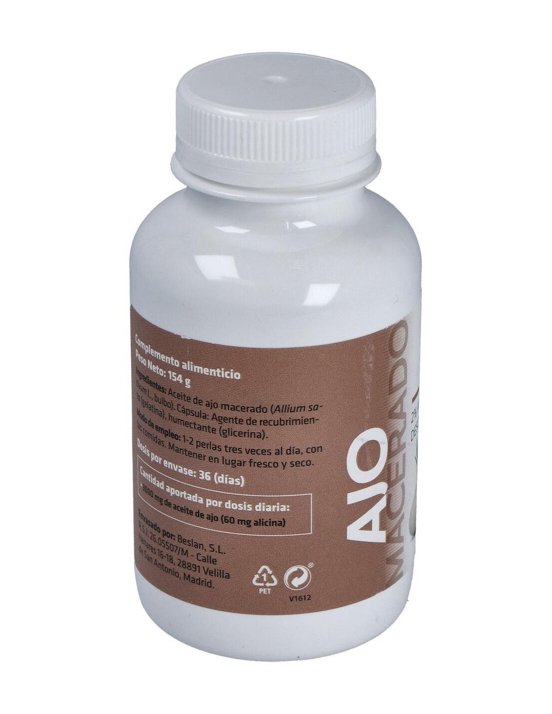 - Cada perla contiene 700 mg de ajo macerado, proporcionando una concentración constante en cada dosis.