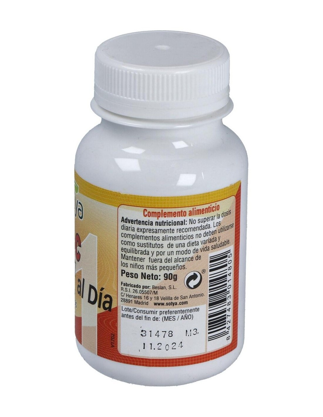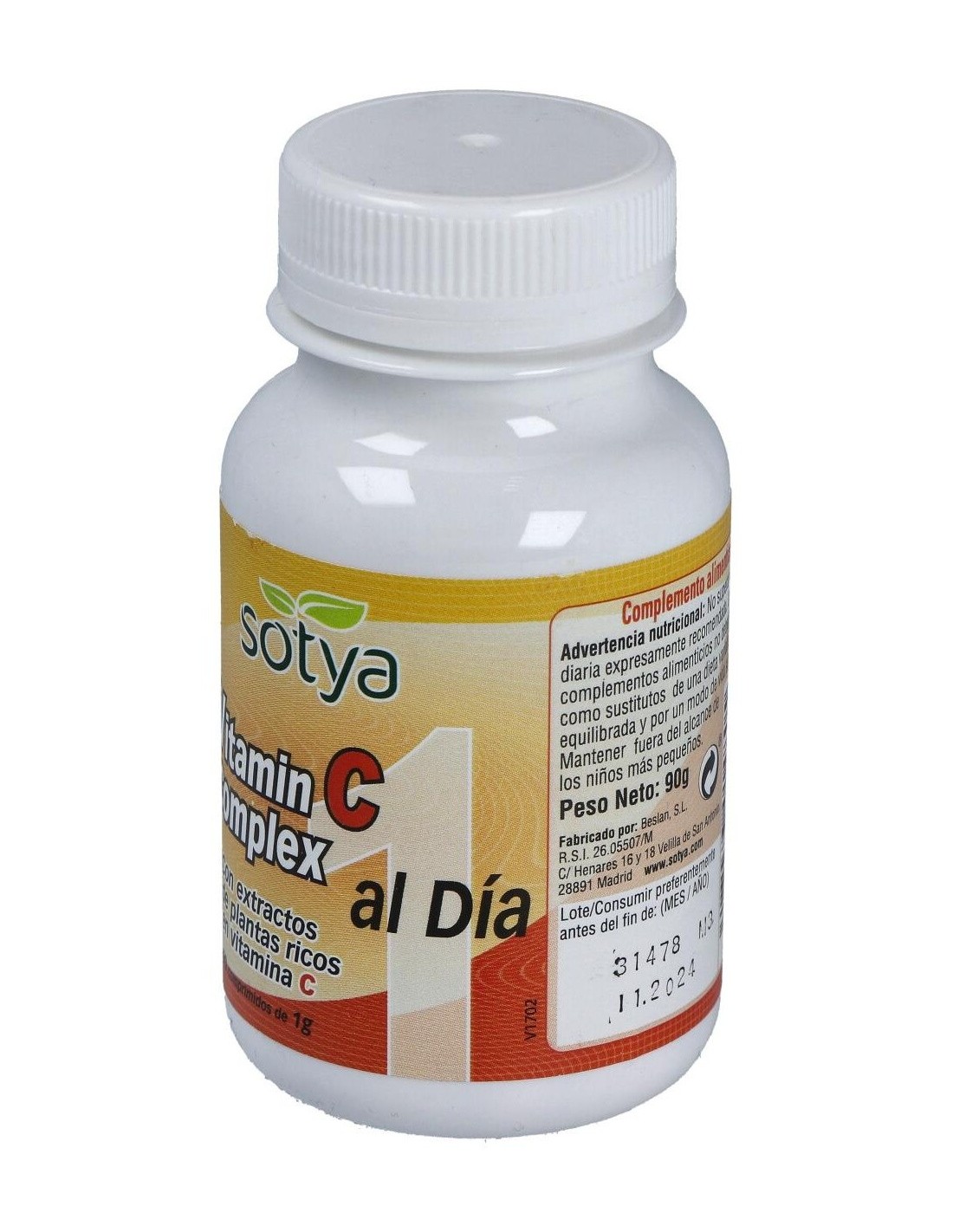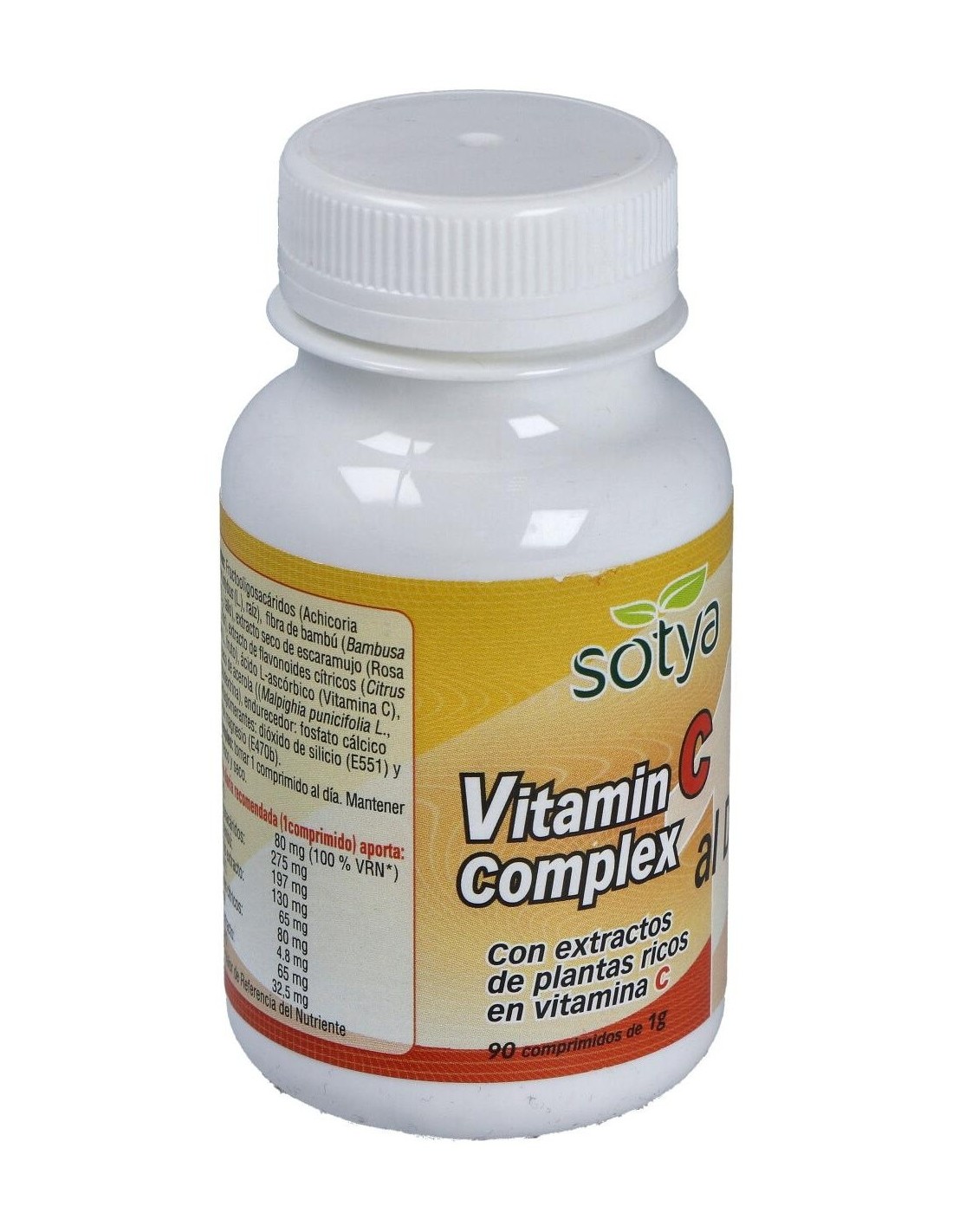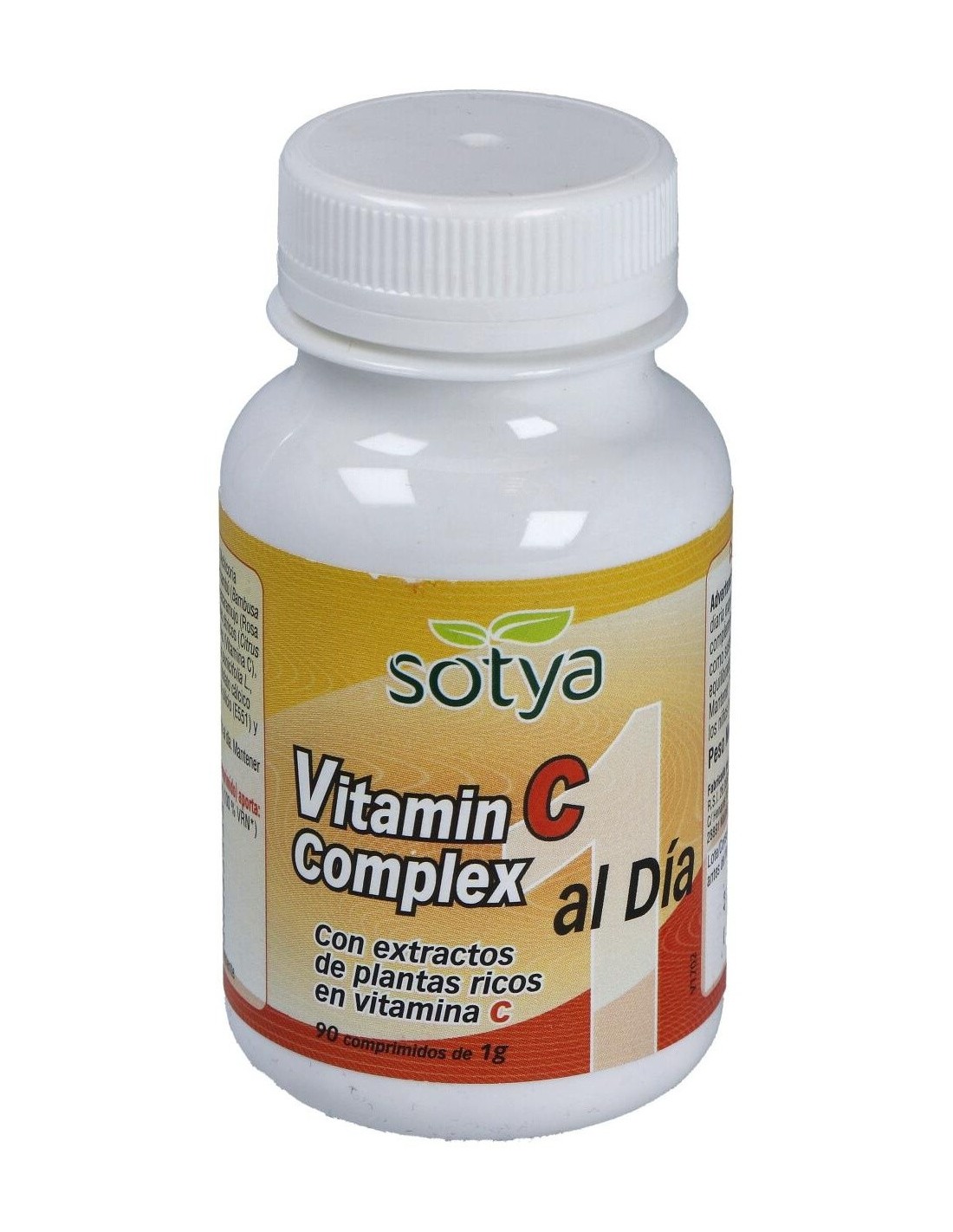 Vitamina C Complex 1 Al Día 1G Comp. 90U de Sotya ofrece una opción práctica para complementar la ingesta diaria de vitamina C, contribuyendo a mantener un aporte constante de este nutriente esencial.