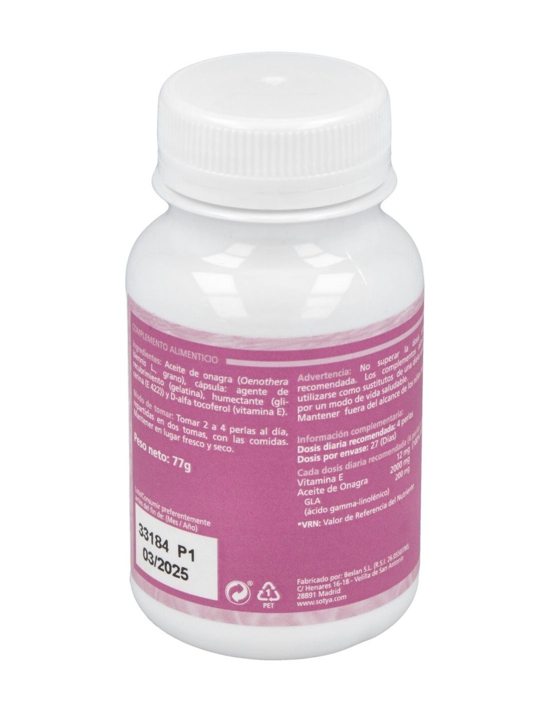 SOTYAEl Onagra 700Mg Perlas 110U de Sotya es un suplemento natural para personas que buscan apoyar el bienestar hormonal y la salud de la piel, gracias a su concentración de aceite de onagra en perlas fáciles de consumir.