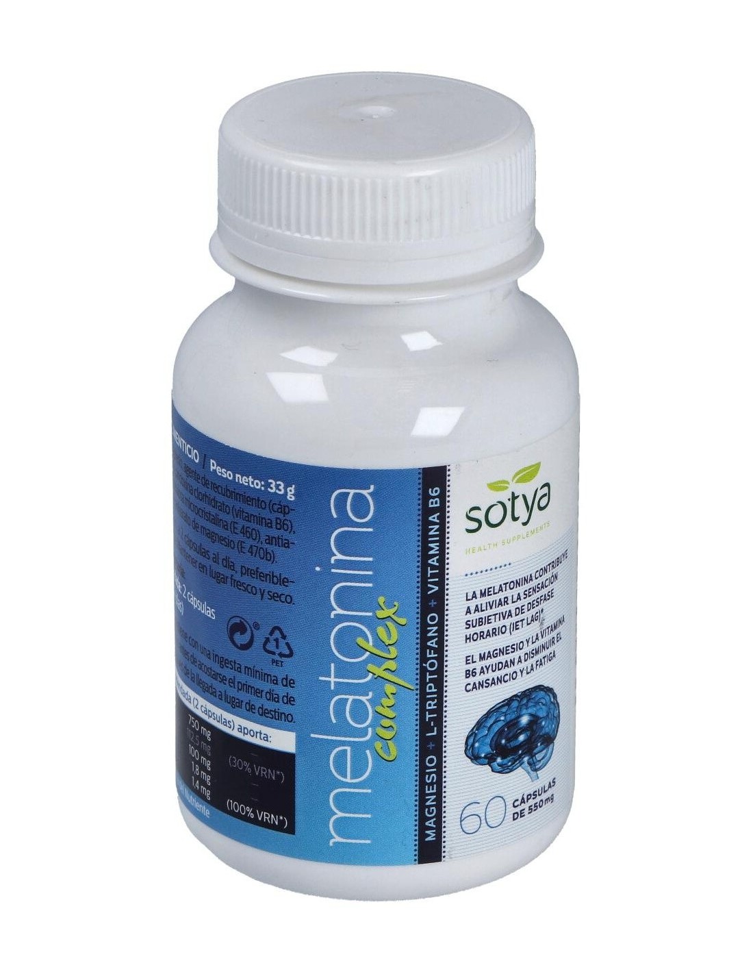 SOTYAMelatonina Complex Magnesio+L-Triptofano+Vitamina B6 550Mg Cáps. 60U de Sotya es un suplemento para adultos que contribuye a la regulación del ciclo de sueño, combinando melatonina, magnesio y vitamina B6 para apoyar el bienestar nocturno.
