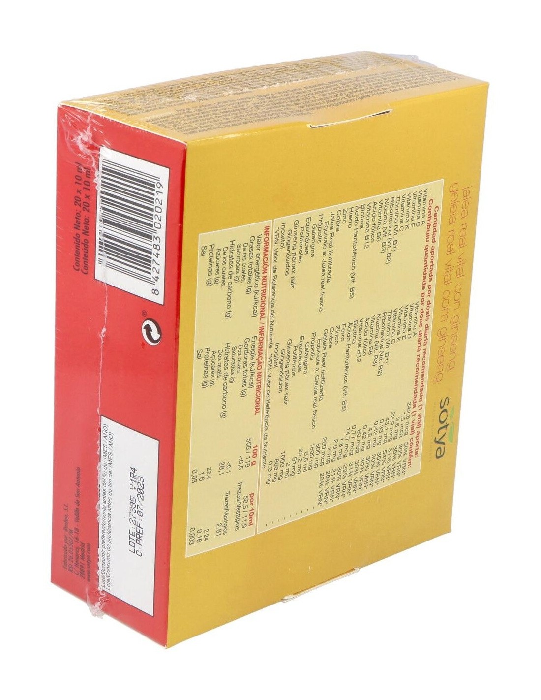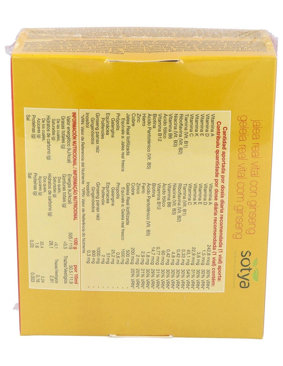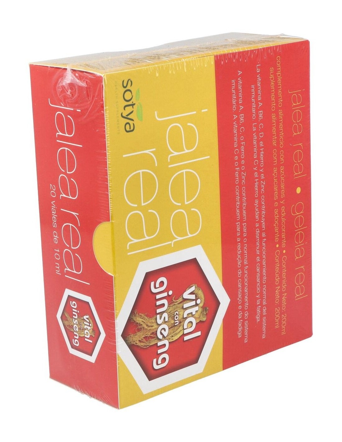 SOTYALa Jalea Real Vital con Ginseng 10ml viales vidrio 20U de Sotya es un suplemento natural para adultos que busca apoyar la vitalidad diaria mediante la combinación de jalea real y ginseng en presentaciones individuales.