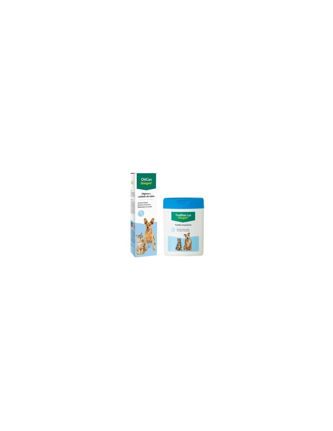 STANGEST vetSolución limpiadora auricular con acción emoliente para disolver el cerumen y reblandecer las costras que se forman en el oído externo de perros y gatos. Toallitas higiénicas de un solo uso para la limpieza de la piel, los ojos y el pabellón auricular de perros y gatos.